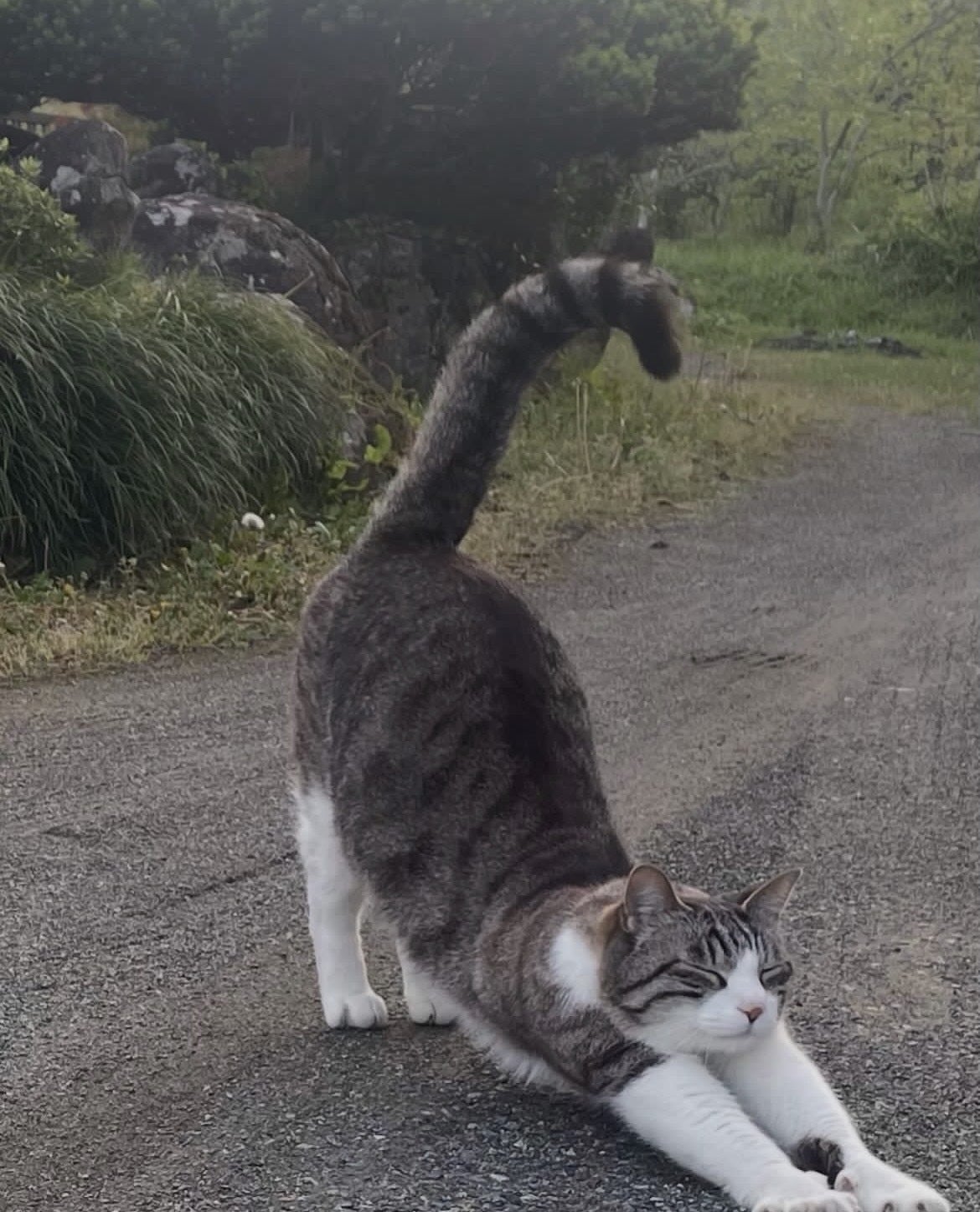 そしてこのポーズは、猫が目覚めたときに「さあ活動するぞー=^_^=」という気合を入れる時のポーズ。