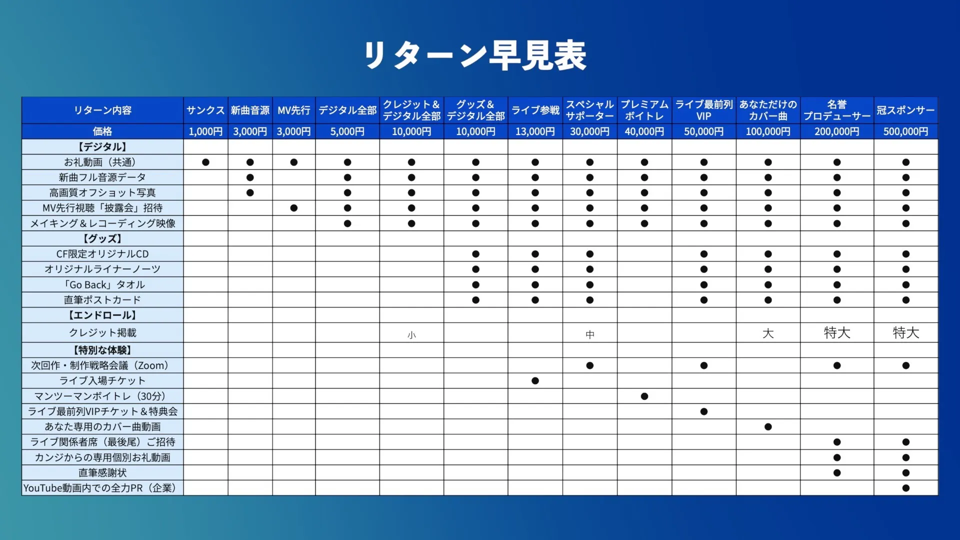 今回のプロジェクトでは、ただ「グッズを買っていただく」のではなく、「一緒に最高の楽曲を作り上げる仲間」として、一生の思い出に残るような体験やコースをご用意しました!