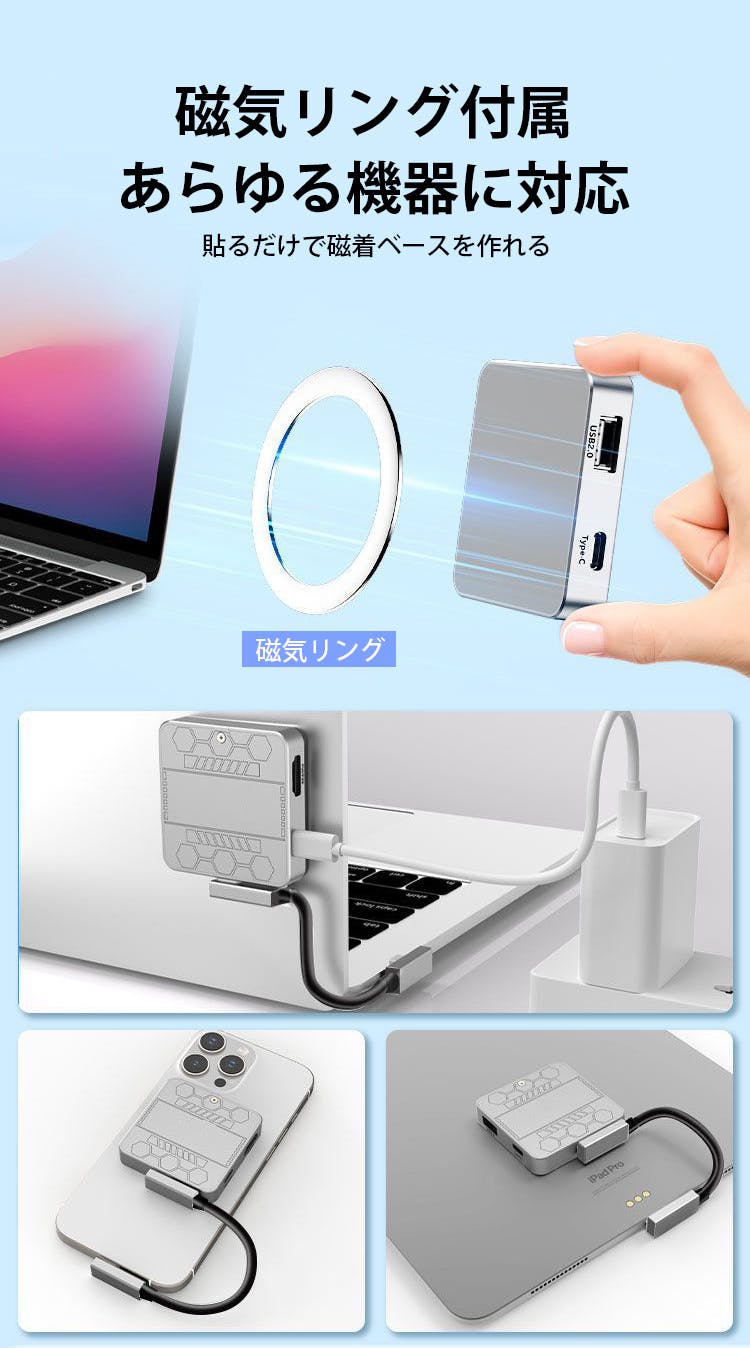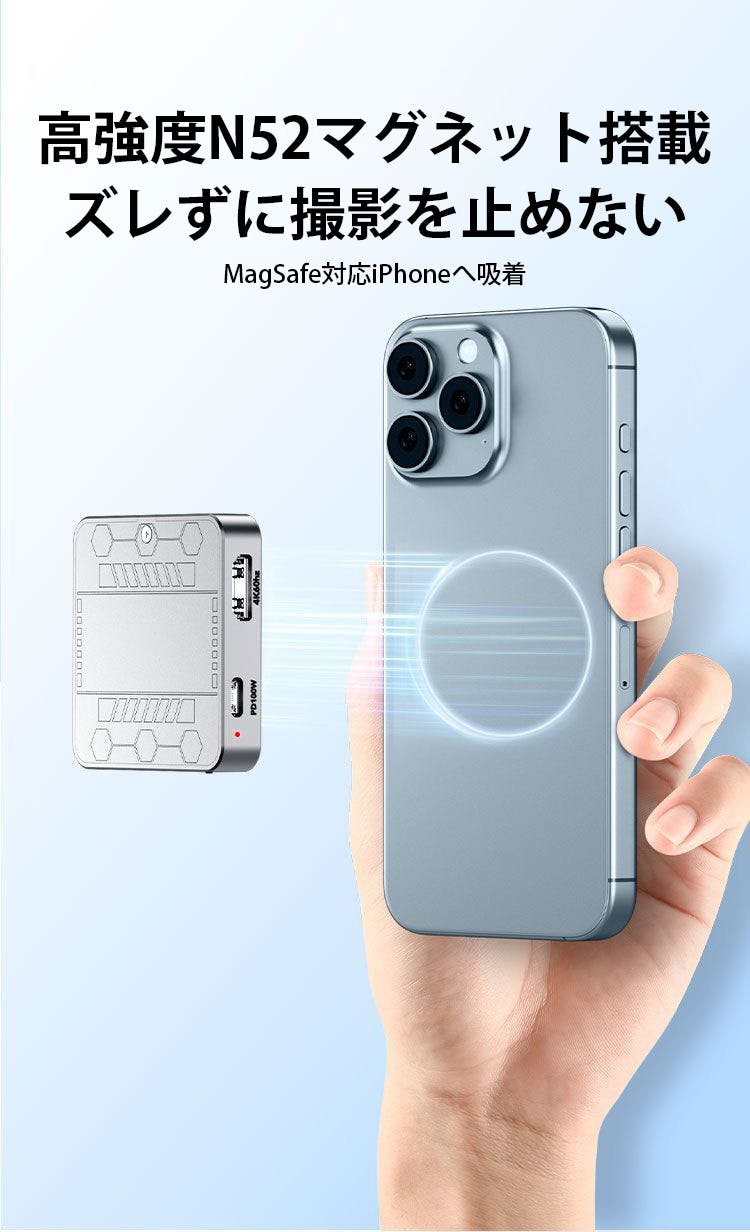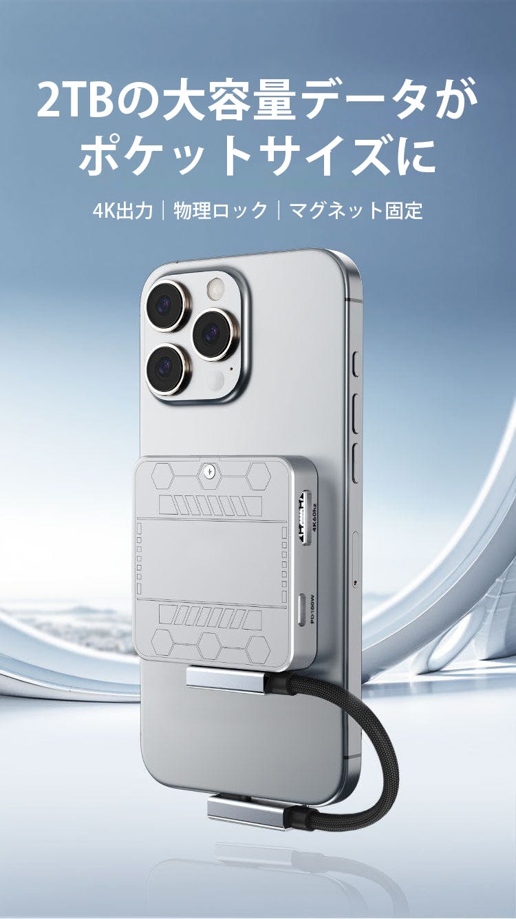 強力マグネットを内蔵し、MagSafe対応iPhoneにそのままピタッと固定できます。貼るだけで撮影・給電・データ保存まで一台でこなし、ケーブルに頼らないスマートな撮影環境を実現します。
