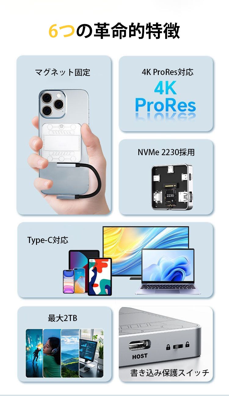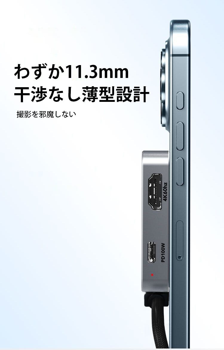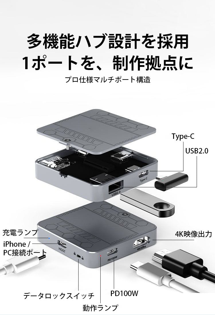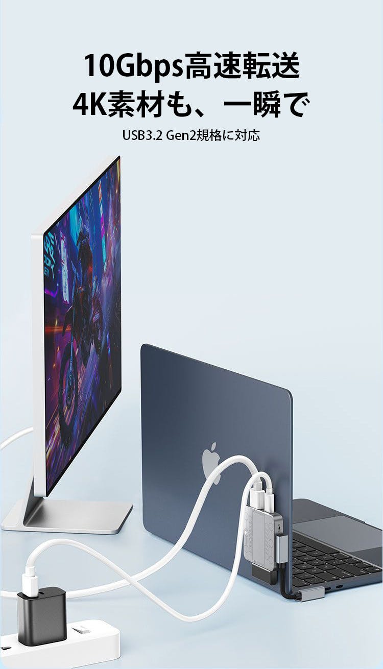 4K映像出力・PD給電・USB拡張ポートを一体化したフル拡張設計を採用しています。映像出力・充電・データ保存を同時にこなせるため、複数のアダプターを持ち歩く必要がなく、撮影から確認・保存までを一台で完結できます。