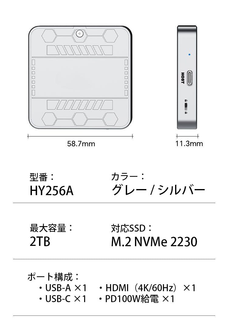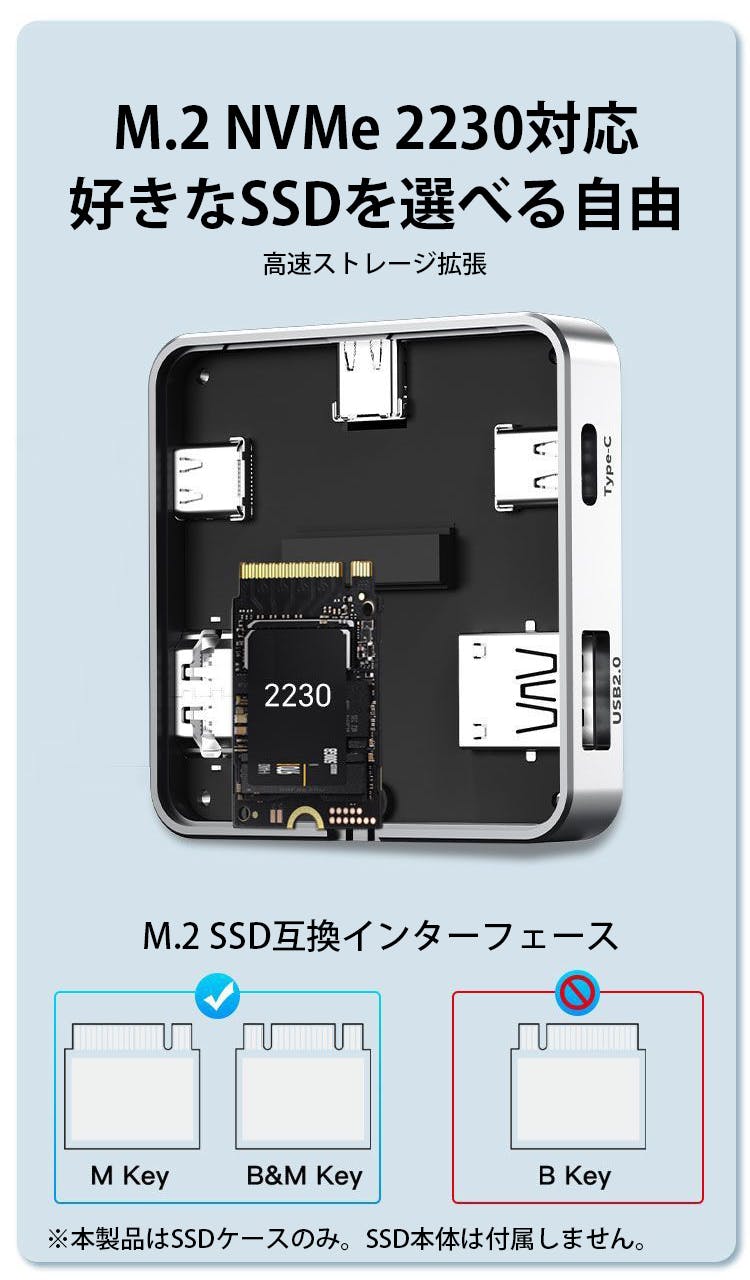 本製品はM.2 NVMe 2230規格に対応しており、自分で選んだSSDを組み込めるカスタム設計のため、必要な容量だけを無駄なく構築でき、ストレージ選びの制限や余計なコストに悩まされることはなくなります。