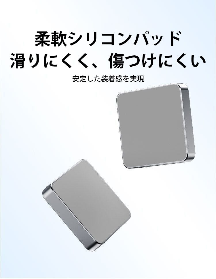背面に柔軟なシリコンパッドを採用し、スマートフォンにやさしくフィットします。装着時のズレや傷を抑えながら安定した密着を保ち、日常使いでも快適な取り付けを実現します。