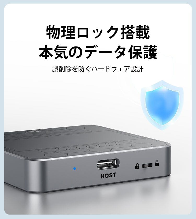 スライド式の物理ロック機構を搭載し、ワンタッチで書き込みを制御できます。意図しないデータの上書きや削除を防ぎ、大切な撮影データをしっかり守ります。