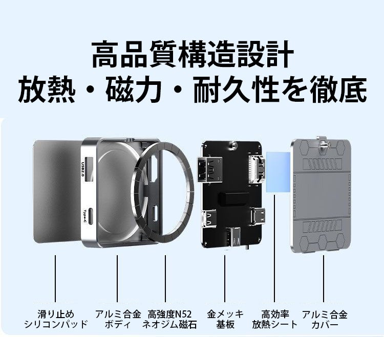 4K映像出力・PD給電・USB拡張ポートを一体化したフル拡張設計を採用しています。映像出力・充電・データ保存を同時にこなせるため、複数のアダプターを持ち歩く必要がなく、撮影から確認・保存までを一台で完結できます。