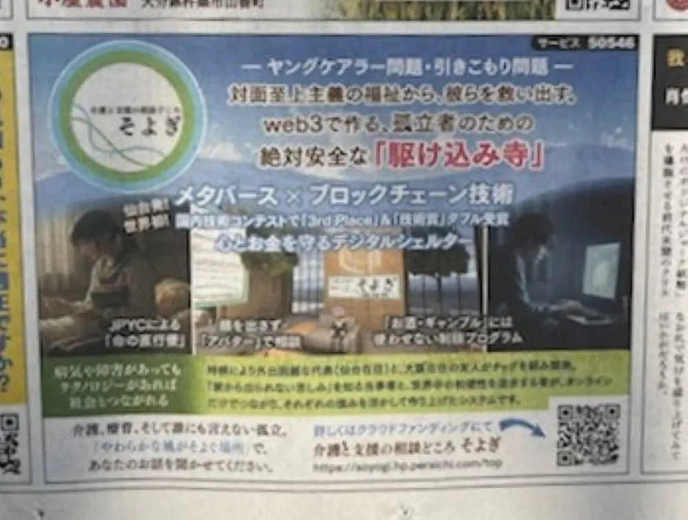 もっと見る いつも温かいご支援と応援をいただき、本当にありがとうございます。「介護と支援の相談どころ そよぎ」代表のヒロです。本日は、プロジェクトを応援してくださる皆様に、2つの大きな前進をご報告させてください!■ 1. 本日(3月10日)のスポーツニッポン(西日本版)に掲載されました!(※ここにスポニチの掲載画像を挿入してください)ついに本日発行のスポニチに、そよぎの活動を掲載していただきました。私たちが今回メディア掲載にこだわったのには、明確な理由があります。それは、虐待や孤立で極限状態にある当事者が「そよぎ」のサイトに辿り着いたとき、「怪しい詐欺サイトじゃないか?」という警戒心を解き、安心してもらうためです。「新聞という公的な場所に載っている窓口なんだ」という事実が、彼らを守る最大の信用(お守り)になります。■ 2. 深夜のSOSに直接届ける「YouTubeバンパー広告」を開始しました!新聞掲載のタイミングに合わせ、YouTubeでの6秒動画広告(スキップ不可のバンパー広告)の配信も自力で設定し、無事にスタートさせました。ターゲットは、深夜に布団の中で「親 逃げたい」「ヤングケアラー」と検索している当事者のスマホです。支援者が探しに行くのではなく、誰にも言えない苦しみを抱えている彼らの日常の画面へ、「声を出さなくていい、安全な避難所があるよ」というメッセージをピンポイントで直接届けています。稼働してすぐに、すでに数百回規模で当事者の目に触れ始めています。■ 最後に既存の福祉の窓口に行けない、電話もかけられない。そんな「見えない孤立」の中にある命へ、そよぎの存在が着実に届き始めています。クラウドファンディングの挑戦も、まだまだ続きます。メタバースシェルターと、奪われないデジタル財布(ギフテラ)のシステムをさらに強固にし、一人でも多くの若者を救うため、引き続きの応援と、SNS等での情報の拡散(シェア)に何卒ご協力をお願いいたします!