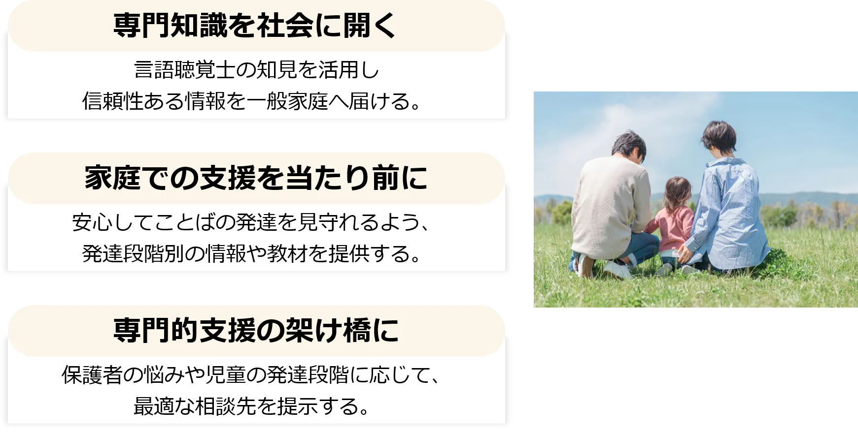 言語聴覚士の専門知識を社会に開き、家庭・教育・医療をつなぐことばの支援の仕組み構築を目指しています。