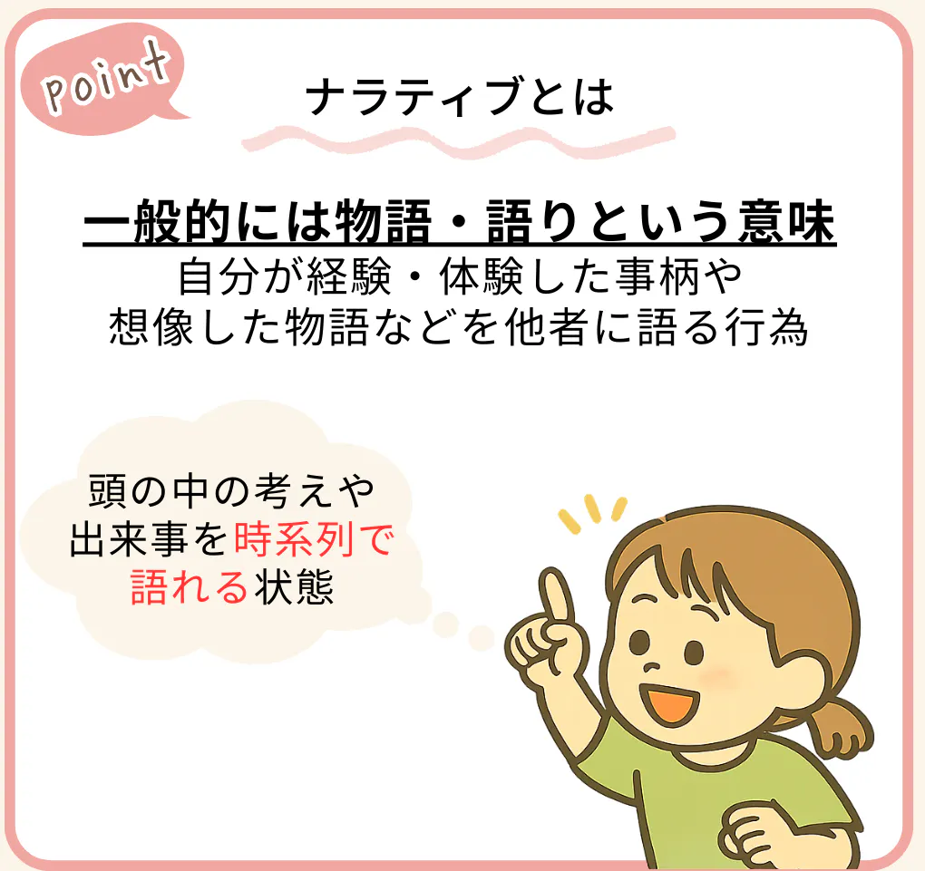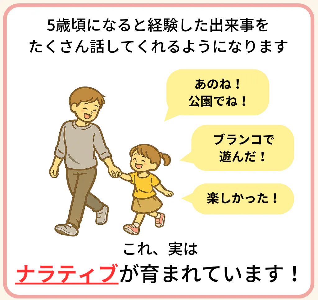 よく、こどもが自分が経験した出来事を話してくれることがあります。この何気ないやりとりの中で、実は「ナラティブ」が育まれています。