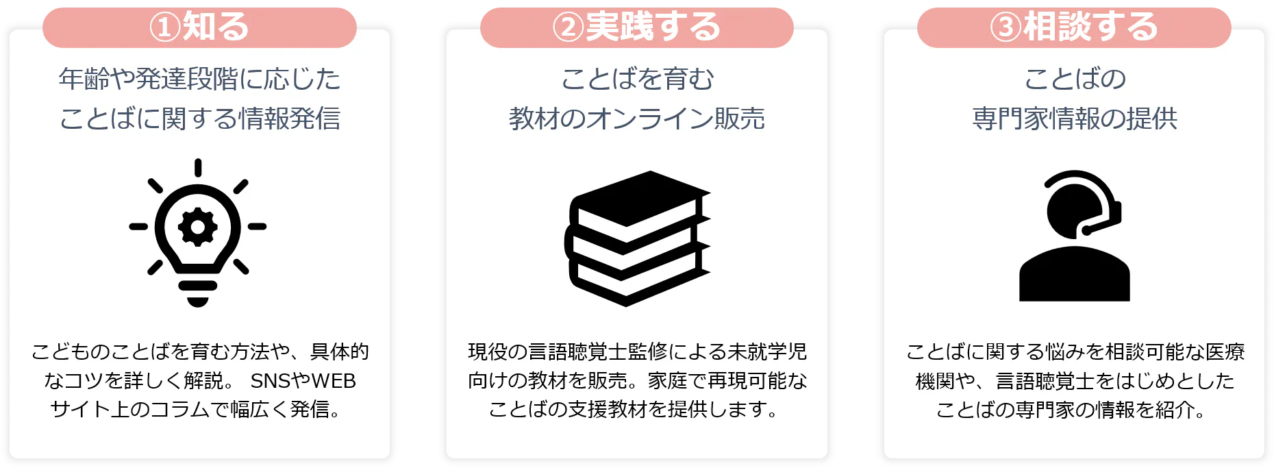 具体的には、Coco上で保護者がこどものことばに関して「①知る」「②実践する」「③相談する」といった仕組みを提供します。