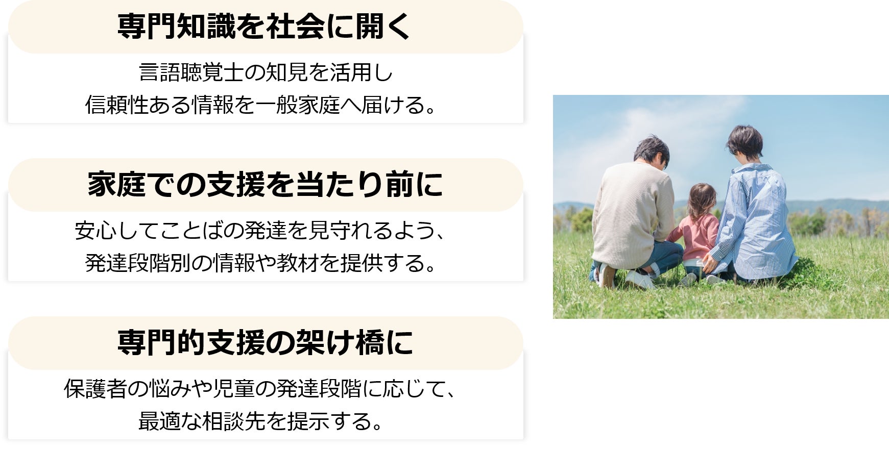 言語聴覚士の専門知識を社会に開き、家庭・教育・医療をつなぐことばの支援の仕組み構築を目指しています。