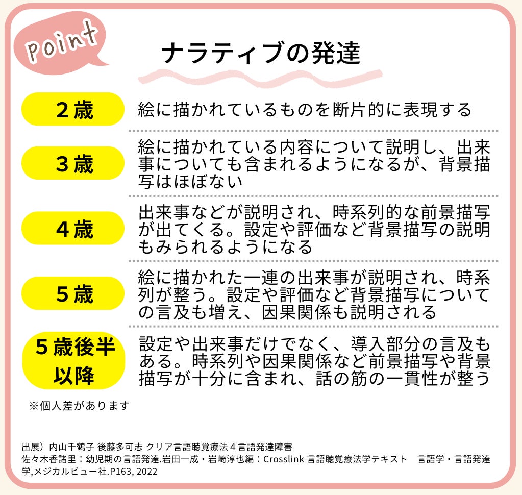 これは、こどもが頭の中の考えや出来事を時系列で語れる状態です。ナラティブが育まれると、作文や読み書きの力の土台となります。