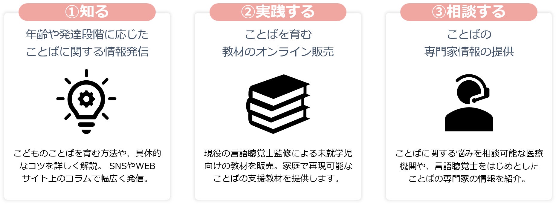 具体的には、Coco上で保護者がこどものことばに関して「①知る」「②実践する」「③相談する」といった仕組みを提供します。