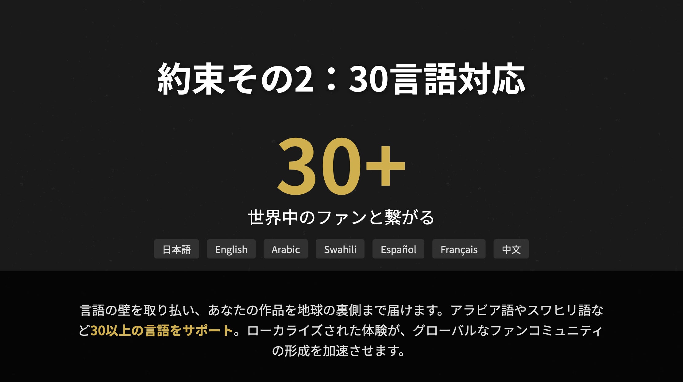 30言語への標準対応: 日本語、英語、中国語から、アラビア語、スワヒリ語まで対応し、言葉の壁を越えた応援を可能にします 。