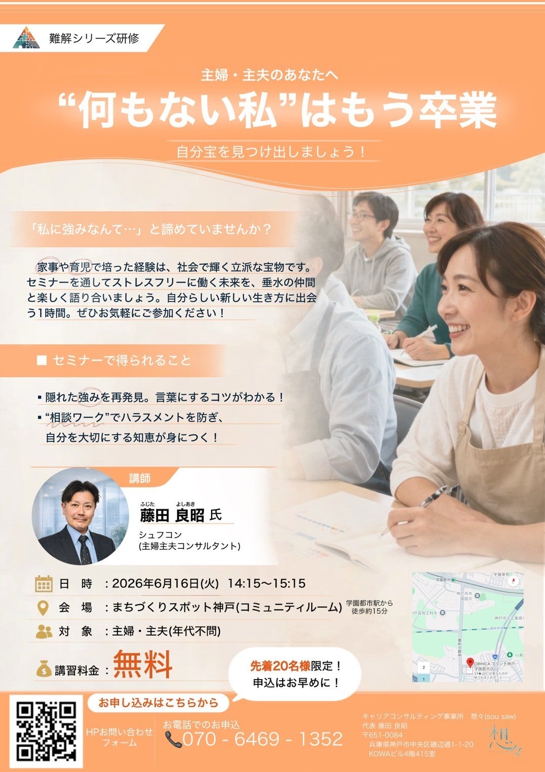 2026/04/02 11:55支援者の皆様、いつも温かい応援をありがとうございます!「想々」の藤田良昭です。本日は、新たなプロジェクトの進捗をご報告させていただきます。 来る2026年5月7日10時15分、神戸(まちづくりスポット神戸)にて、主婦・主夫の方々を対象としたキャリアセミナーを開催することが決定いたしました!チラシのキャッチコピーは、『“何もない私”はもう卒業』です。日々、家事や育児に奮闘されている方々の中には、「自分には社会で通用する強みなんてない…」と自信をなくしてしまっている方が少なくありません。しかし、約2万回超の面談を重ねてきた私から見れば、それは大きな見落としかもしれません。家事や育児で培った経験は、社会で輝く立派な「自分宝(じぶんたから)」です。 今回のセミナーでは、隠れた強みを再発見し、言葉にするコツ自分を大切にするための“相談ワーク”を通じ、参加者の皆様が自分らしい新しい生き方に出会える1時間を提供します。皆様からいただいたご支援のおかげで、こうして地域に根ざした一歩を踏み出すことができています。本当にありがとうございます。これからも「誰もが唯一無二の資産として尊重され、満開の笑顔で咲き誇れる垂水」を目指して、全力でリボンを回し続けていきます!引き続き、応援をよろしくお願いいたします! もっと見る