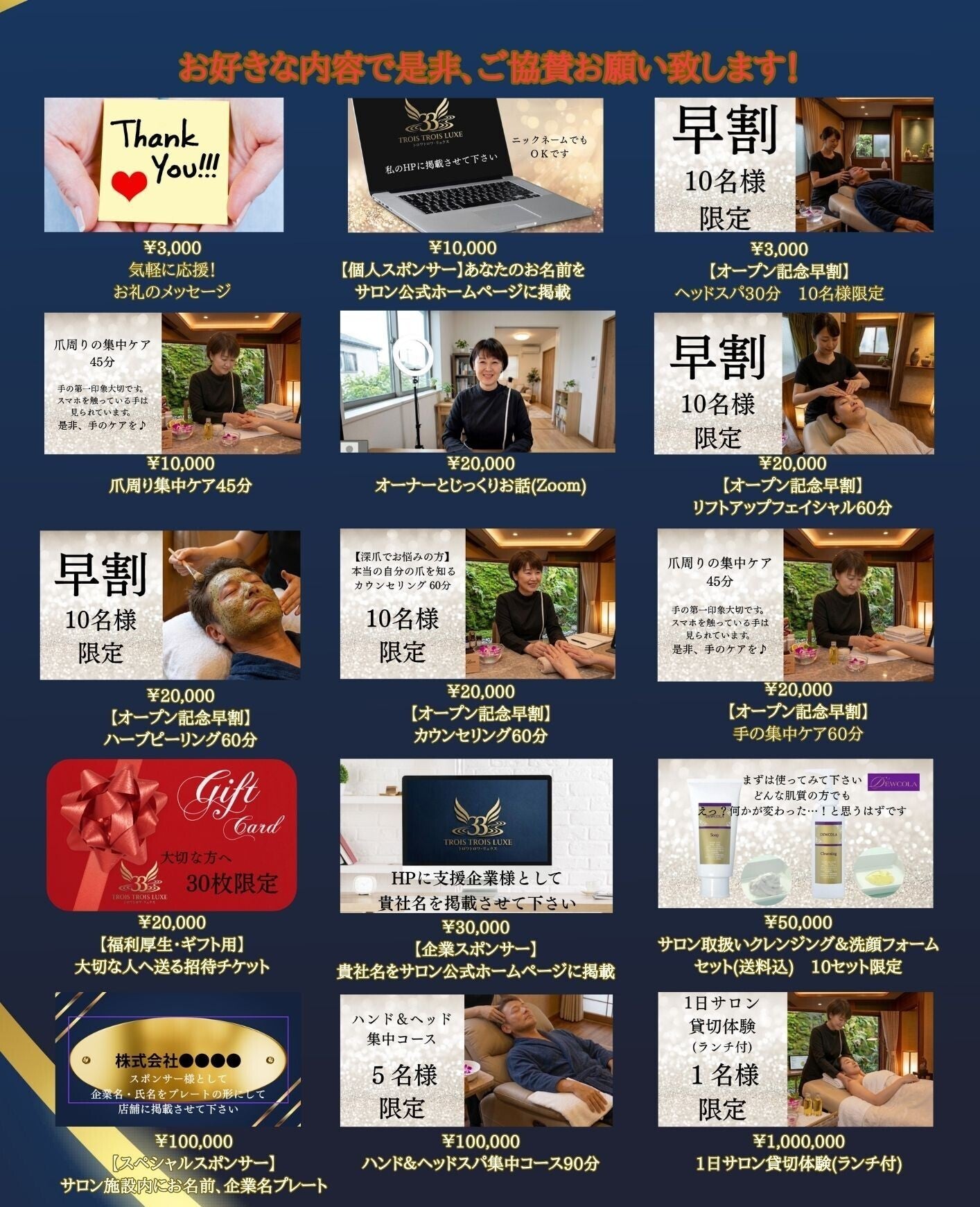 2026/04/10 20:14みなさん、リターンをふるさと納税の返礼品のように是非楽しんで下さい♪なかなかサロンには行けない!という方でも、楽しんで頂けるリターンをご用意しておりますなかなか行けないけれど、「私が協賛したサロン」として、いつか是非行きたい場所として遠くの方も是非ご協賛お願い致します①何か私に応援メッセージをお願い致します♪ ¥3,000②当サロンのホームページにあなたのお名前を協賛者として 掲載させてください【個人の方】 ¥10,000 【企業】¥30,000③オーナーの私と2時間楽しくじっくりzoomでお話 ¥20,000④大切な方へのプレゼント用として施術を受けられるギフトカード ¥20,000⑤サロンで使っているクレンジグ&洗顔フォームを使って肌質改善 ¥50,000【男女お使い頂けます 男性も是非クレンジグをして下さい】⑥敷地内にあなたのお名前(ニックネーム可)または企業名をプレートにて 設置させてください サロンが存続する限り設置致します 広告としてご利用頂けますので、サロンに来店の方に必ず目に触れる ところに設置いたします ¥100,000皆様にとっての『居場所』として、是非当サロンに誕生に関わって頂きご協賛お待ちしております もっと見る