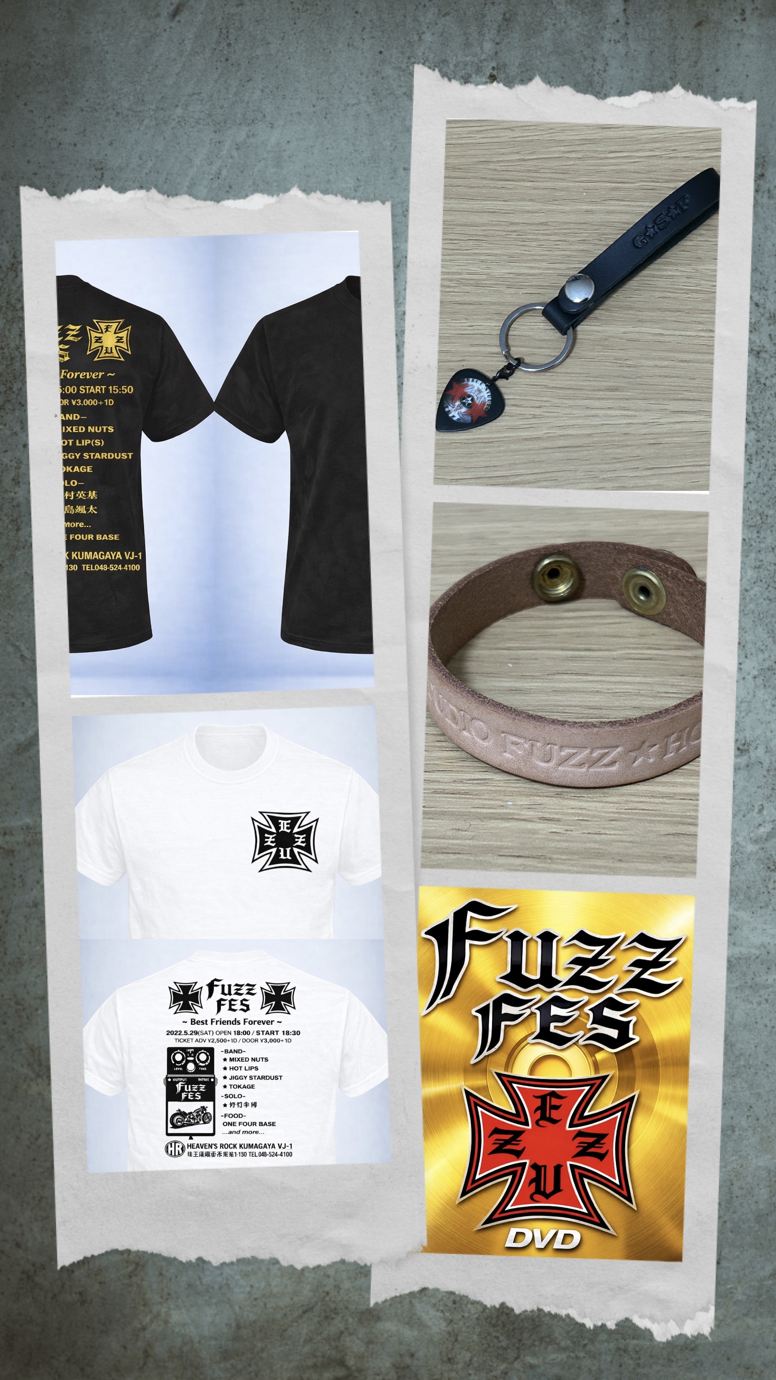 ライブチケットに加え、ライブタイトル「FUZZ FES」のロゴが入った各種グッズを用意しています。当日来場できない方向けにライブDVD、グッズのみのリターンもあります。