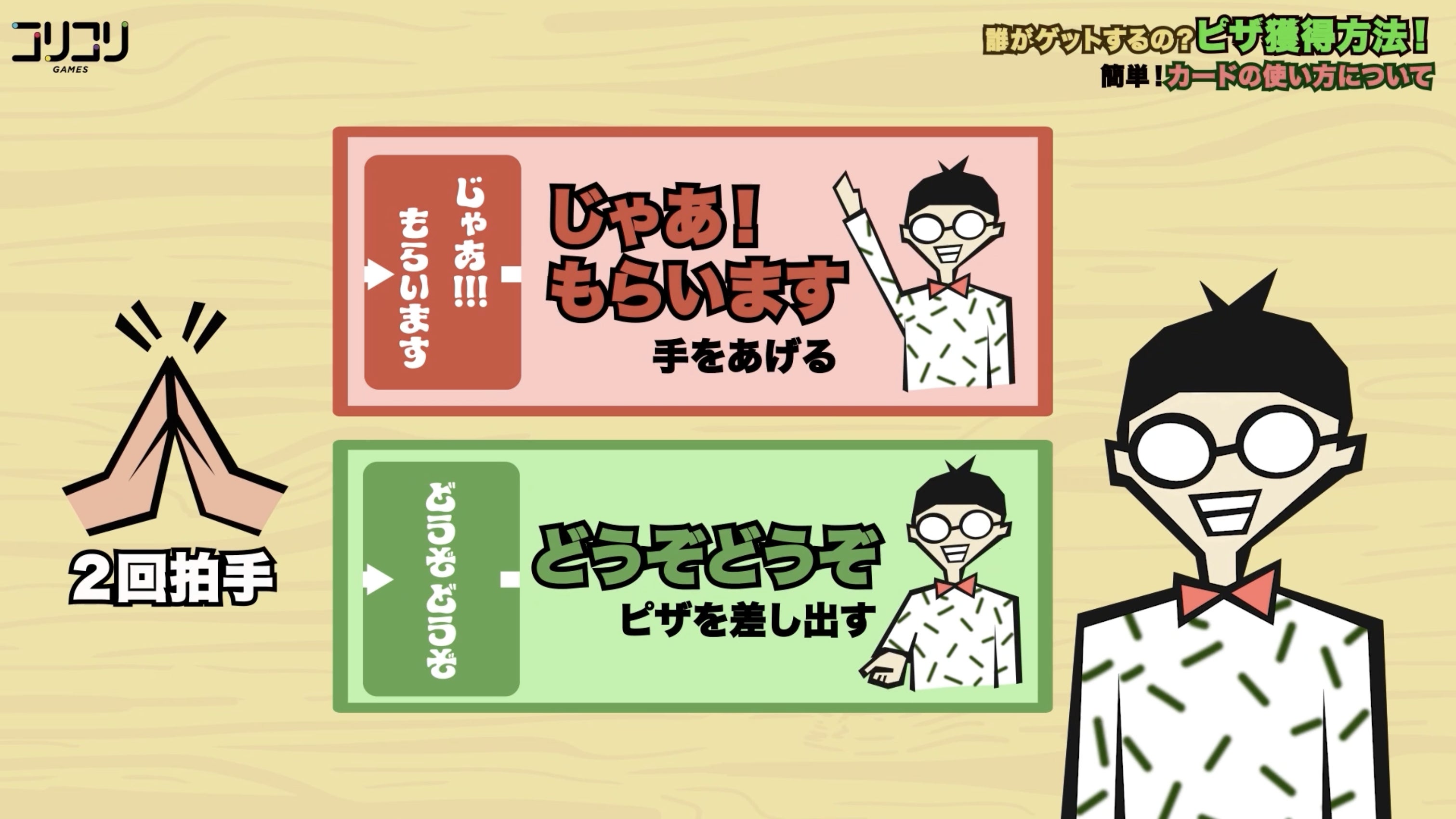 ピザを取り合う時には、ジェスチャーと掛け声をしてカードを読み上げるという仕組みになっています。