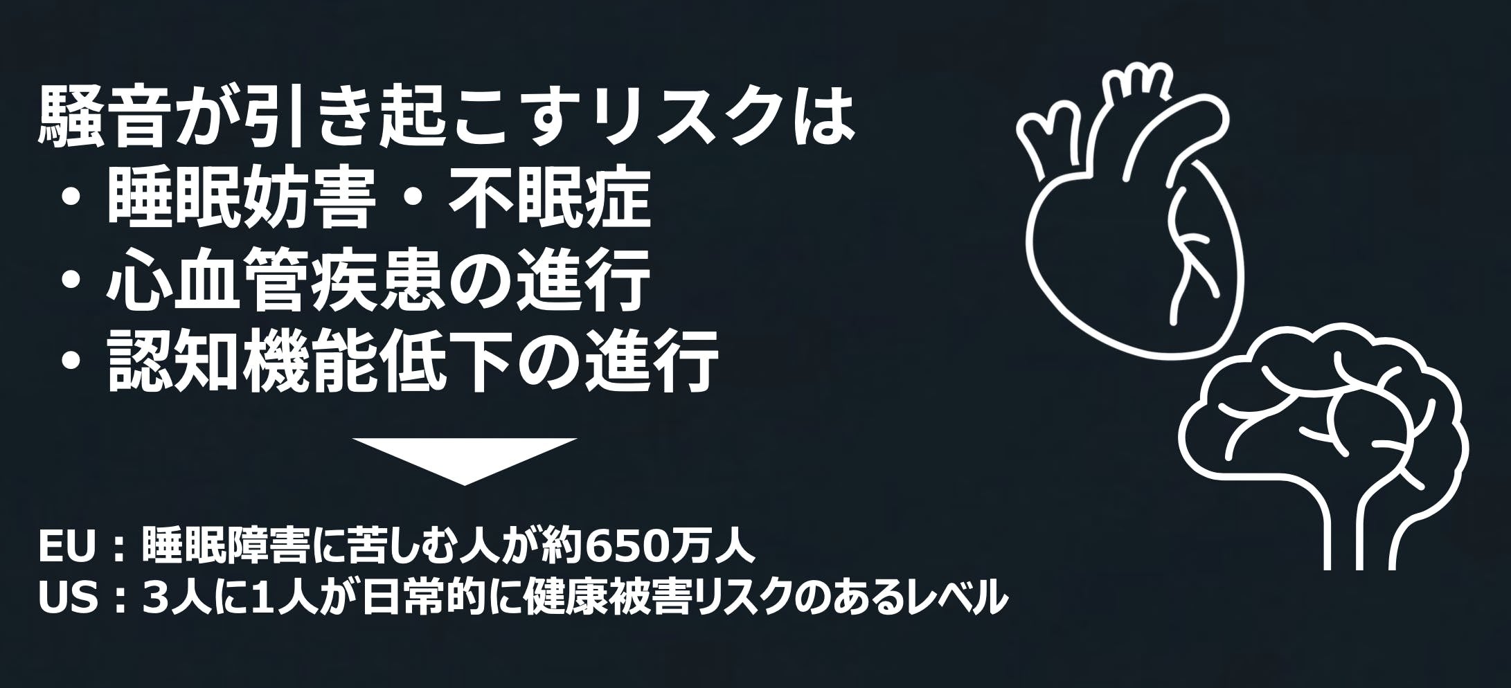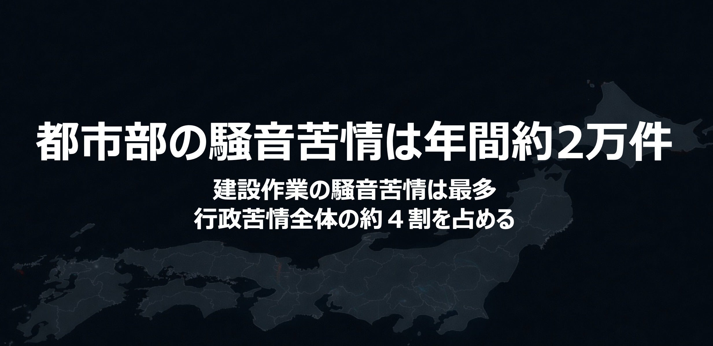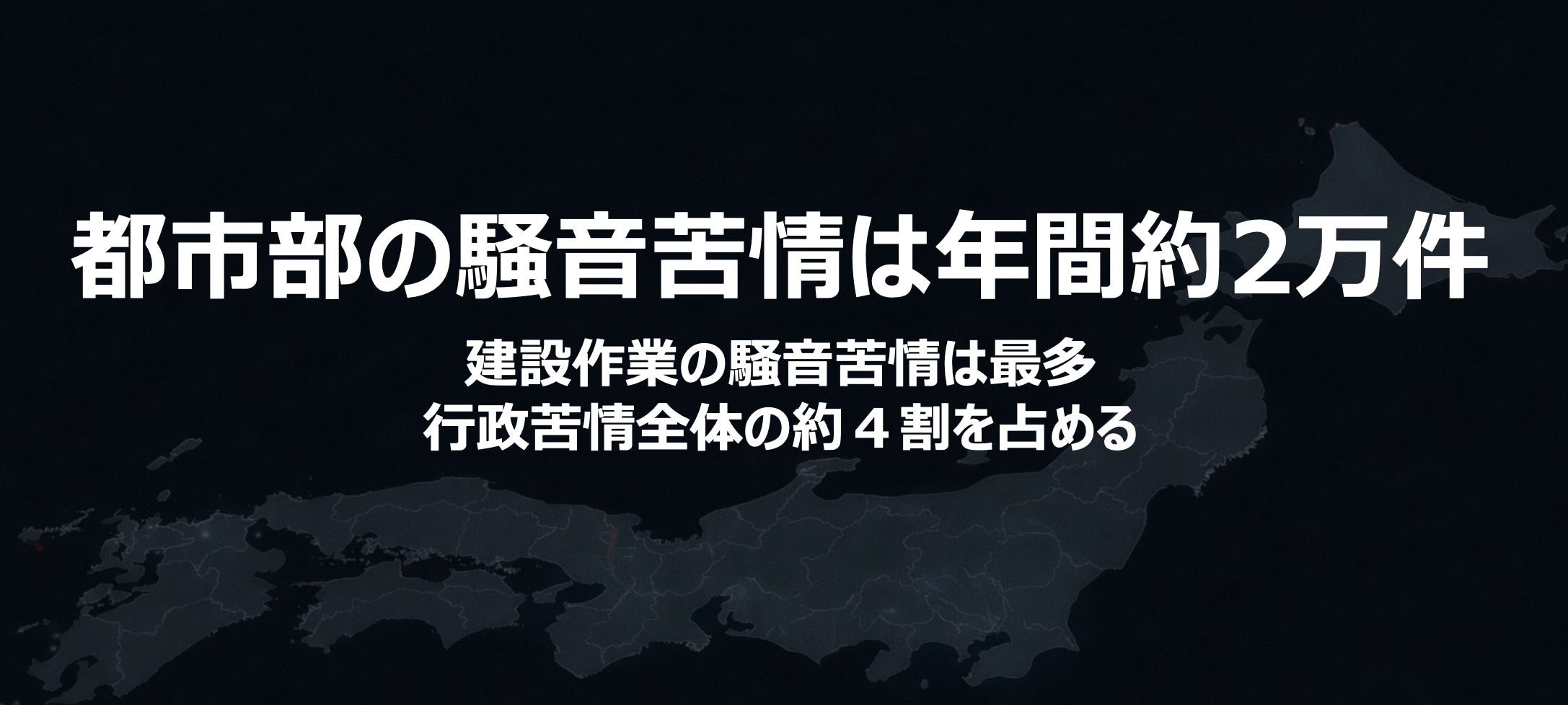 WHOが騒音を健康に深刻な悪影響を及ぼす公衆衛生上の問題と警告しており、睡眠妨害、不眠、心血管疾患の進行、認知機能低下の進行などのリスクが示されています。さらに日本の都市部では、騒音苦情が年間約2万件あり、建設作業の騒音苦情が大きな割合を占めています。