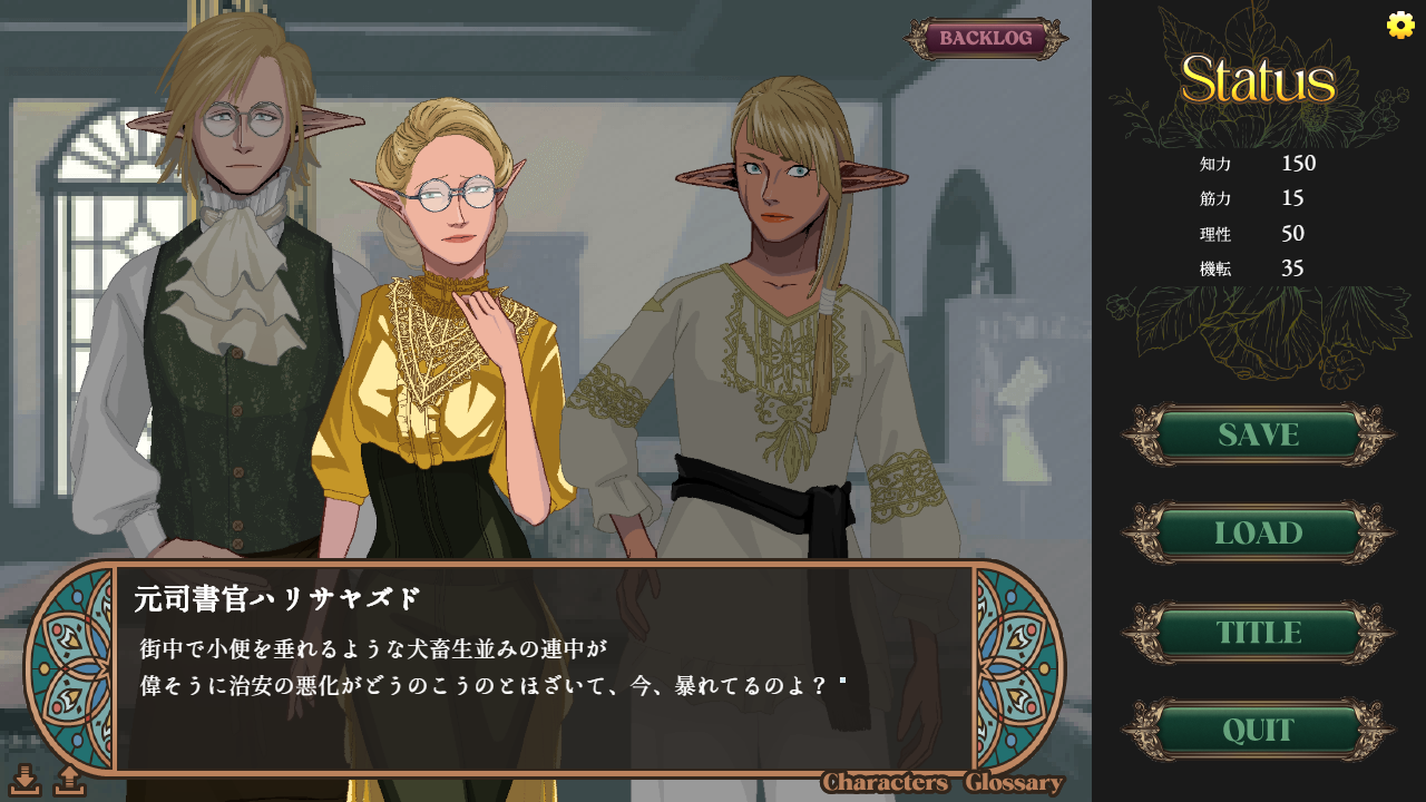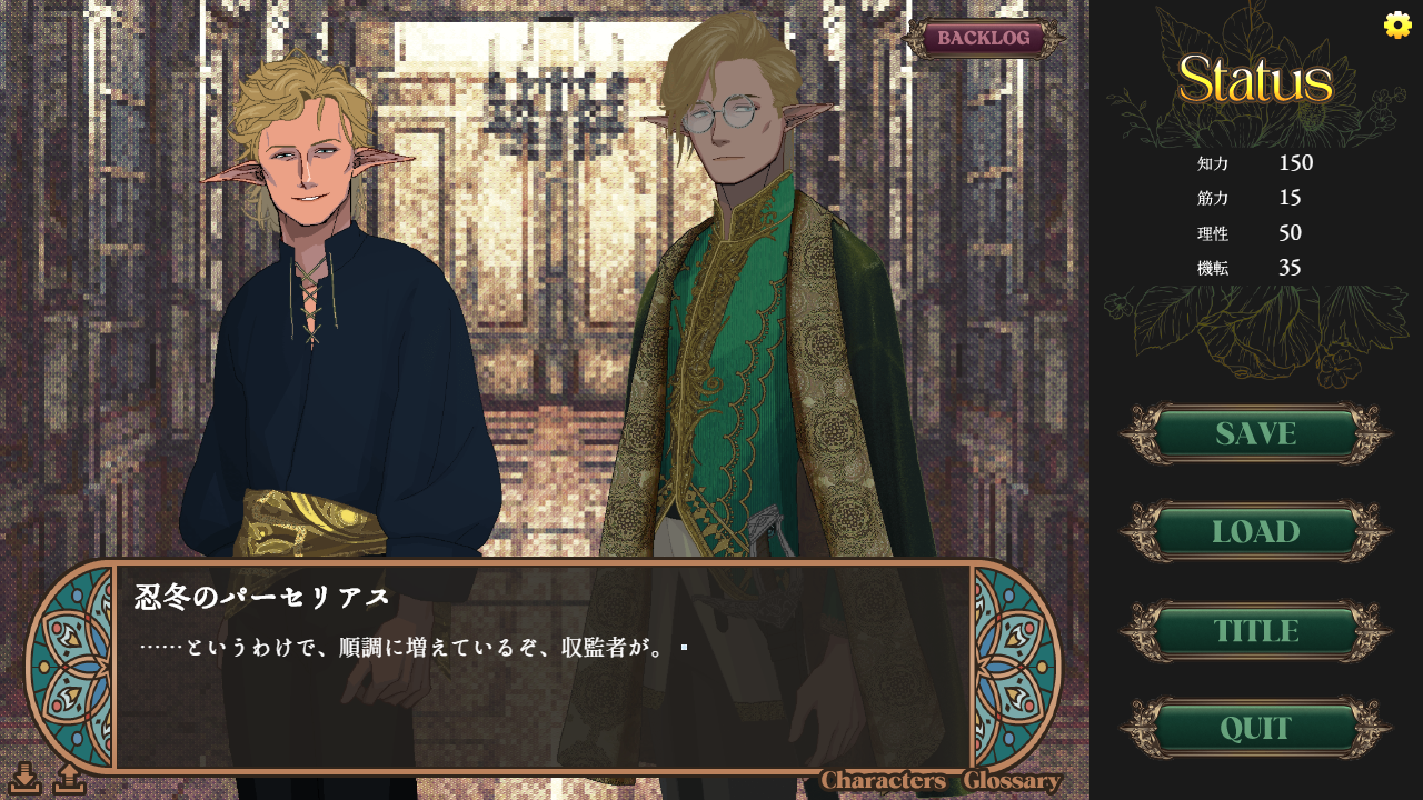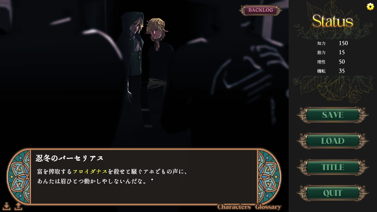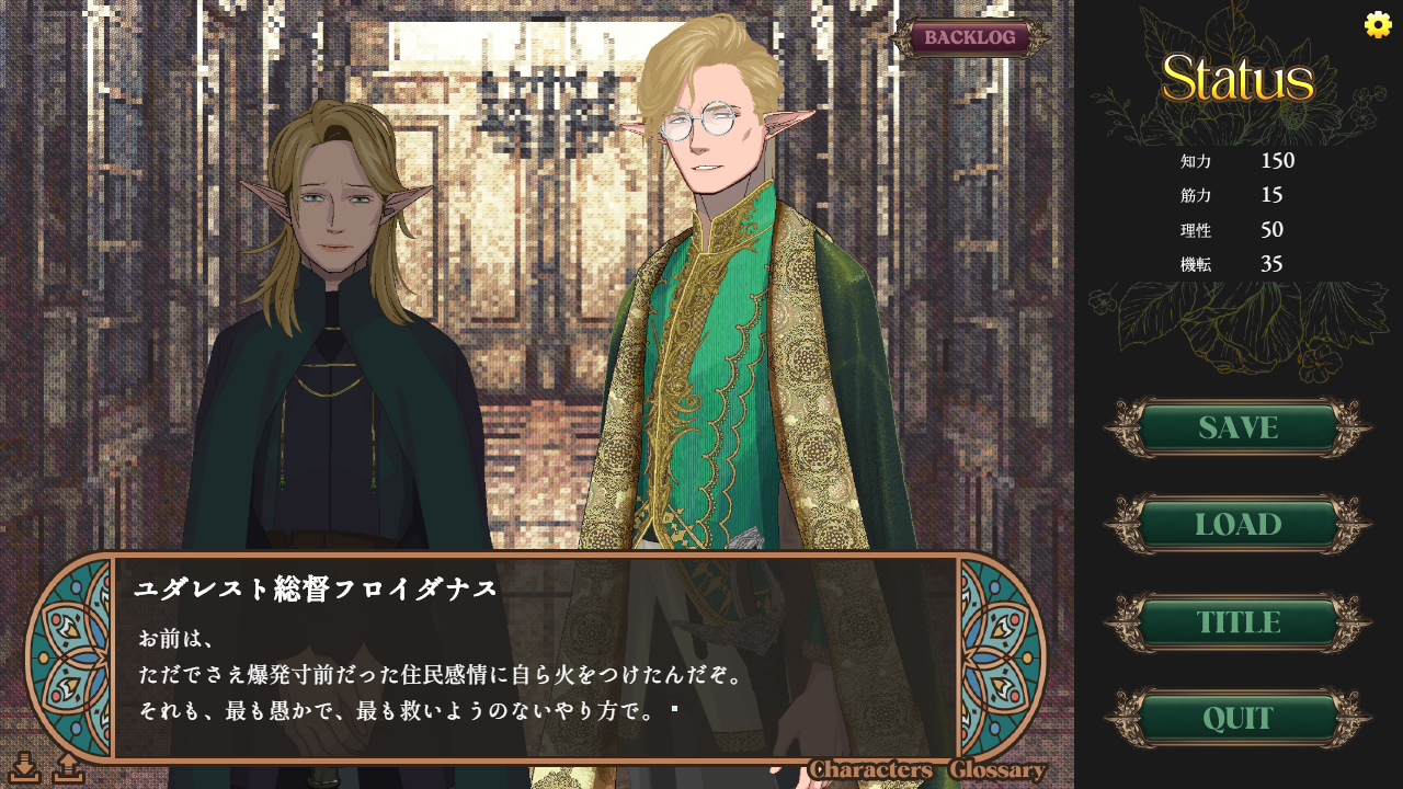 本作は、圧倒的な作り込みのハイファンタジーでありながら、その裏側にSF的な真実が隠された、独自の重厚な世界観を持つ選択式アドベンチャーゲーム(ADV)です。ヴィジュアルノベル、ノベルゲームともいいます。