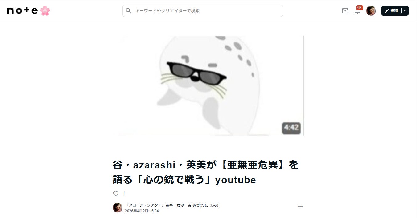 2026/04/08 20:30 谷英美『アローン・シアター』応援団・福島支部長が、今朝のご支援でクラファン目標達成のゴールテープを切りました。皆様、本当にありがとうございます!!!昨夜は、note仲間のマイトンさんが、こんな嬉しい記事を書いて下さいました。その記事のリンクアカウントなくても読めますので、モヒよろ光ったらぜひ。昨夜読んで号泣しました。そして一夜明けたら、目標達成…こんなことってあるのでしょうか。なんかだ狐につままれたような心地です(って、狐はどこをつまむのでしょうね?)。目標は達成しましたが、伝記のご予約受付という意味合いで、引き続きがんばります。何よりも、この【趣旨】を、やむにやまれぬ思いを、一人でも多くの方に知っていただきたいです。どうか、さらに広めていただきたく、よろしくお願い光ります。 もっと見る