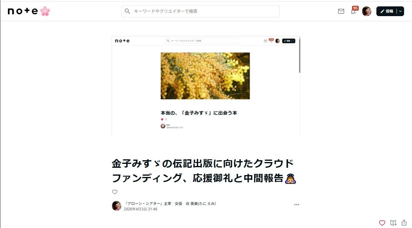 2026/04/03 22:15紹介記事を、たくさんの方が書いて下さっています。noteのリンク本当に、ありがとうございます!!!#金子みすゞ #伝記 #出版 #クラウドファンディング #キャンプファイヤー #谷英美 #note もっと見る