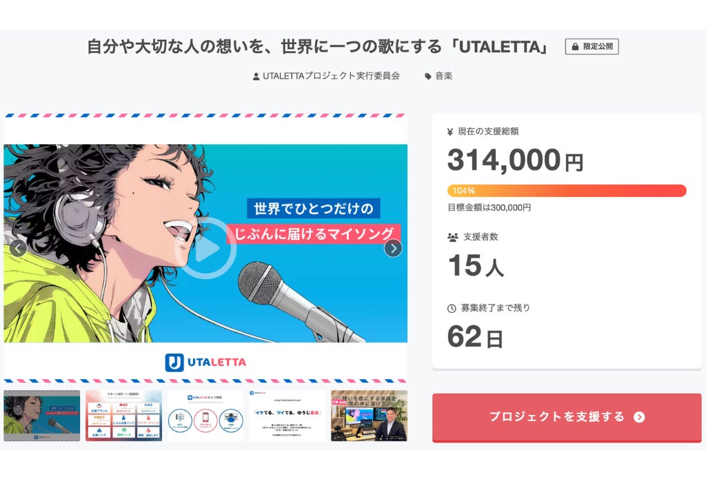 2026/03/30 09:17「自分や大切な人の想いを、世界に一つの歌にする『UTALETTA』」プロジェクト実行委員会です。おかげさまで、本プロジェクトは第1弾の目標金額である30万円を達成することができました。ご支援くださった皆さま、そして情報をシェアしてくださった皆さまに、心より御礼申し上げます。ここからは、より多くの方に「世界でひとつだけのマイソング」をお届けできるよう、引き続きプロジェクトを進めてまいります。目標達成後のご支援も、今後のUTALETTAの活動やサービス向上に大切に活かしてまいりますので、もしよろしければ、プロジェクトページのシェアなどで引き続き応援いただけますと嬉しいです。プロジェクトページはこちら:https://camp-fire.jp/projects/933942/viewご支援いただいた皆さまへのリターンにつきましては、現在準備を進めております。ご案内まで少しお時間をいただきますが、ひとつひとつ心を込めてお届けしてまいりますので、今しばらくお待ちいただけますと幸いです。今後とも「UTALETTA」をよろしくお願いいたします。 もっと見る