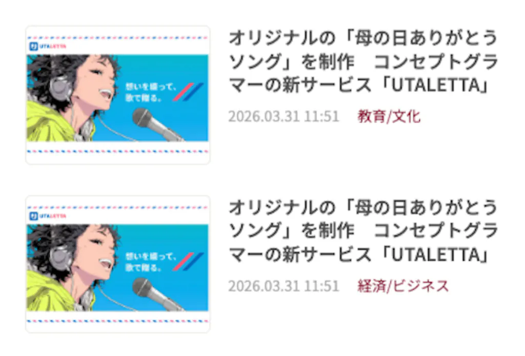 2026/04/01 10:18共同通信社に、UTALETTAをご紹介いただき、その記事がニュースサイト各社に配信されました。この記事はニュースサイト『OVO』や『Yahoo!ニュース』などにも掲載されています。応援いただいている皆さまのおかげで、このような機会につながりました。引き続き、UTALETTAを多くの方に届けられるよう活動してまいります。・株式会社共同通信社オリジナルの「母の日ありがとうソング」を制作 コンセプトグラマーの新サービス「UTALETTA」・Yahoo!ニュースhttps://news.yahoo.co.jp/articles/a76ef7fc440bade16d214d62f6c1bea4b152f4d5 もっと見る