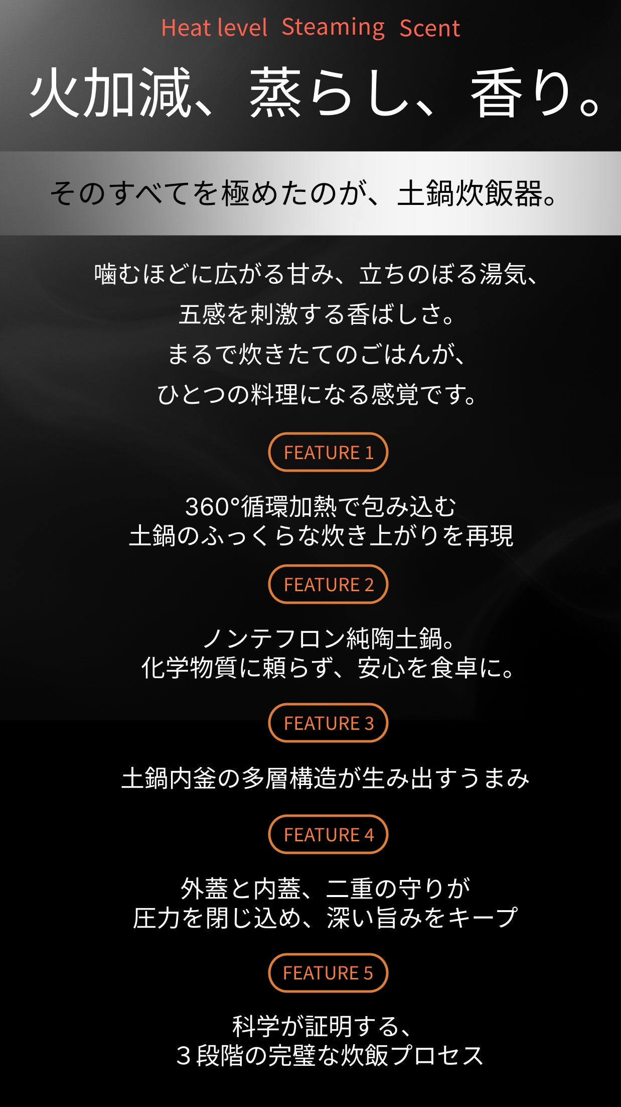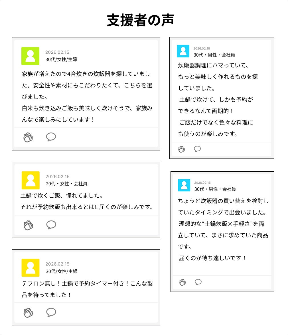 わたしたちは、カマノ 土鍋炊飯器を皆様にお届けする為に、現在工場とデザイン・仕様を実現できるよう、プロジェクトを誠心誠意進めています。 しかしながら、開発中の工程において、デザイン・仕様が一部変更になる可能性もあります。 デザイン・仕様の変更はより良い商品を皆様のお手元に届けたいからであることご理解頂けると幸いです。