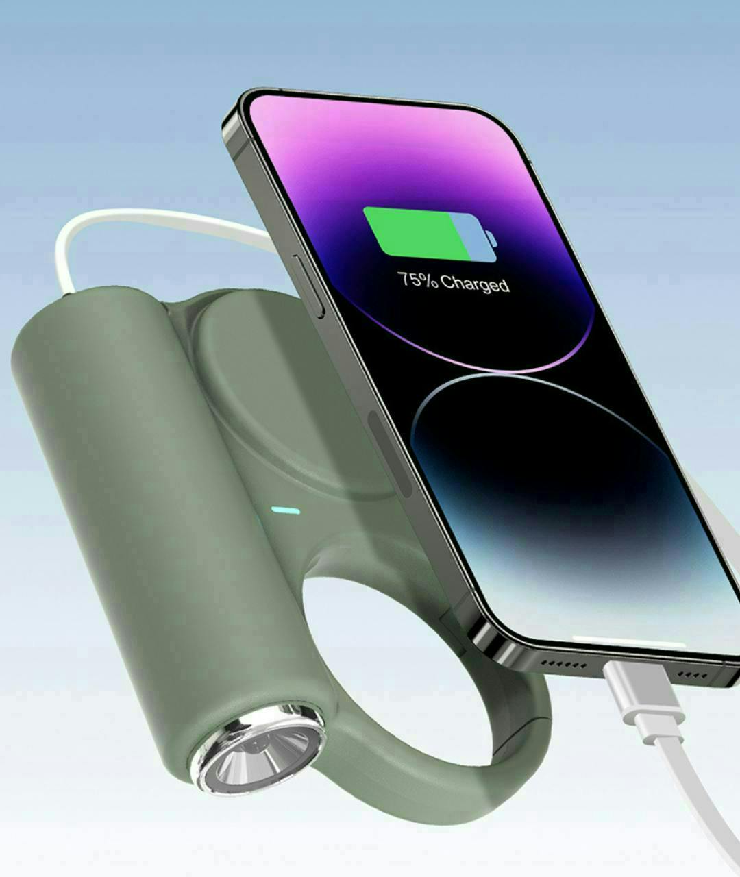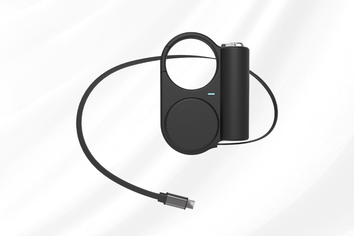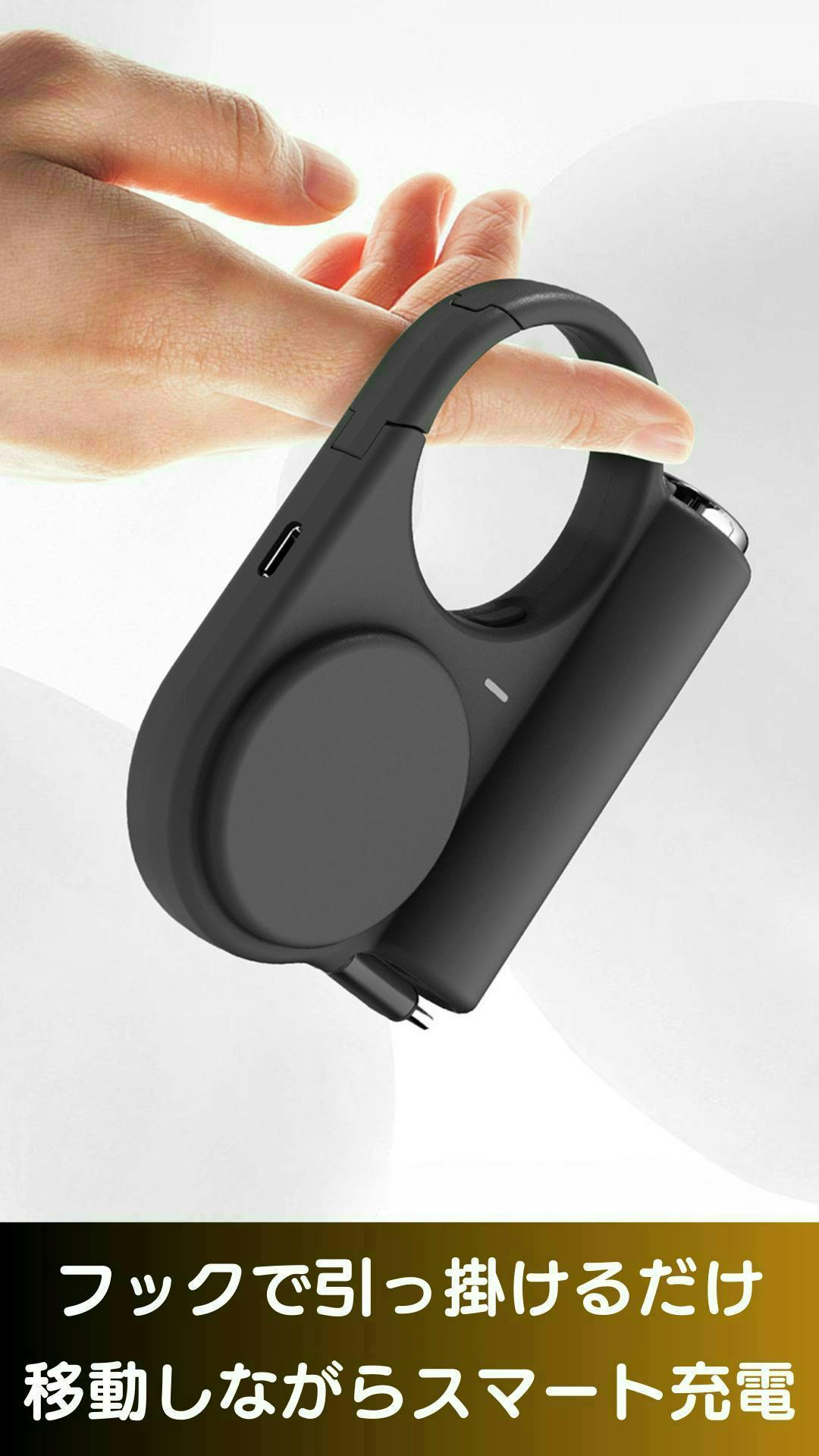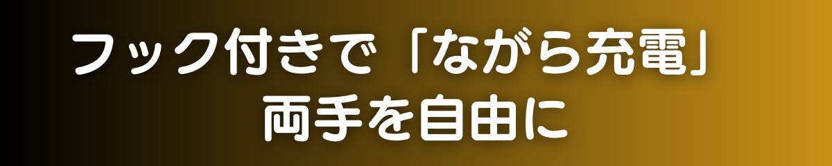 フック付きデザインだから、バッグやベルト、リュックにサッと引っ掛けるだけで、スマートに充電可能。