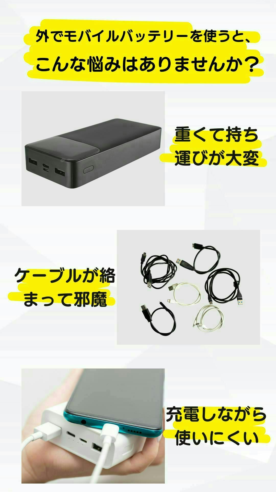 この商品に出会ったきっかけは、アウトドアや移動中に感じる 「充電の不便さ」 でした。バッグの中で絡まるケーブル、持ち運びながらの充電の煩わしさ、夜のキャンプや停電時にスマホのライトでは物足りないと感じること……。日常のちょっとしたストレスを解消できる、より使いやすいモバイルバッテリーがあればいいのに。そう思っていたところ、この製品に出会いました。