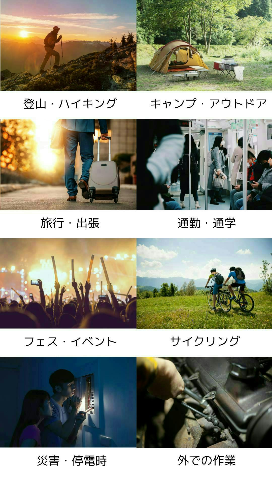 登山やキャンプではリュックに引っ掛けて手ぶらで充電。旅行や通勤時も軽量&コンパクトで持ち運びラクラク。さらに、フェスやサイクリングでも邪魔にならず、LEDライト付きだから災害時にも活躍。アウトドアから日常まで、どこでも便利に使えるモバイルバッテリーです。