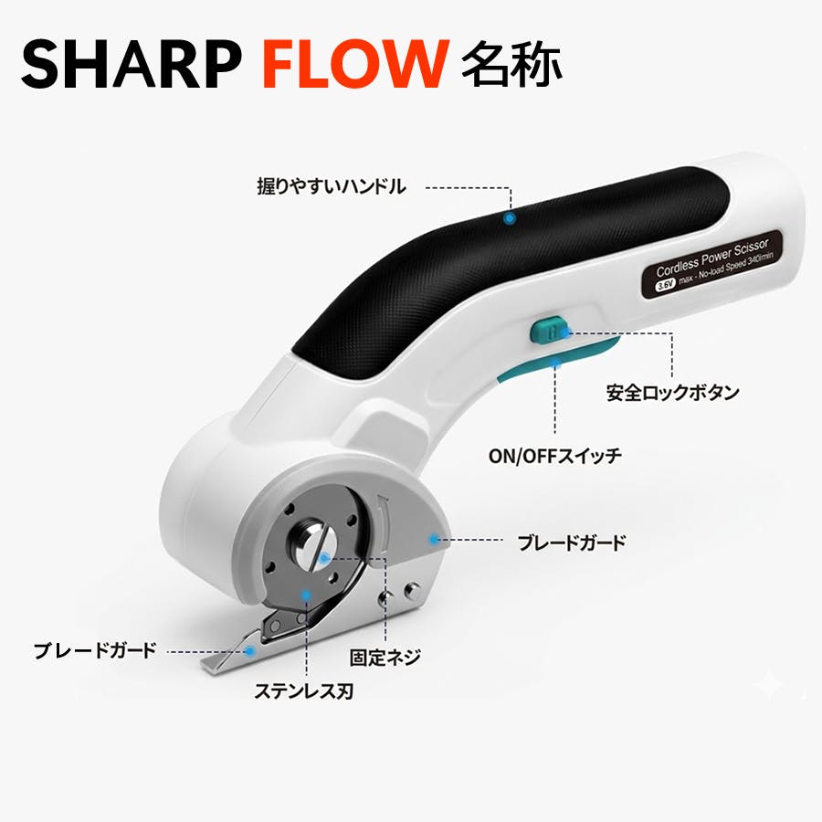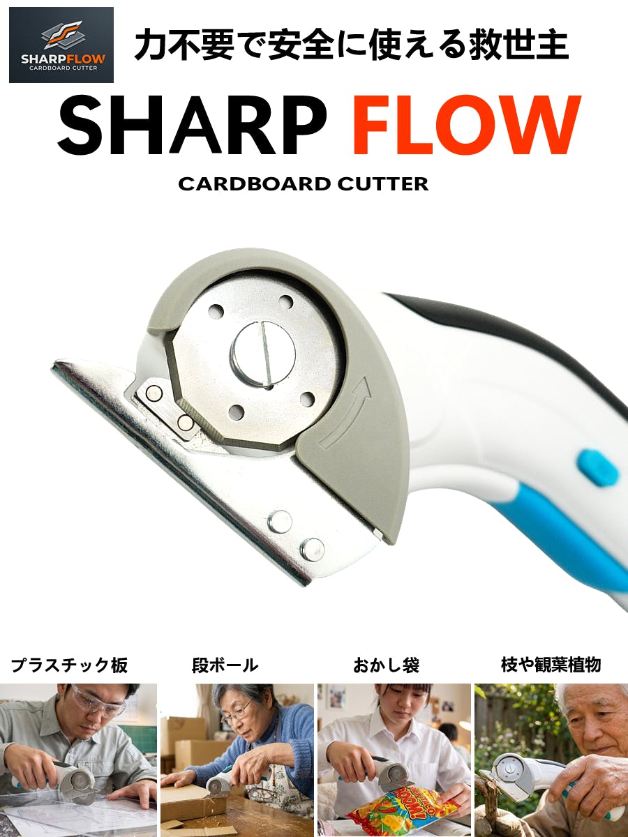 日々の生活の中で感じる「切ること」へのストレス。これを**「パッと」一瞬で解決したい。** そんな想いから、強力なパワーと究極の使いやすさを兼ね備えた電動マルチカッターSHARPFLOW~シャープフロー~が完成しました。