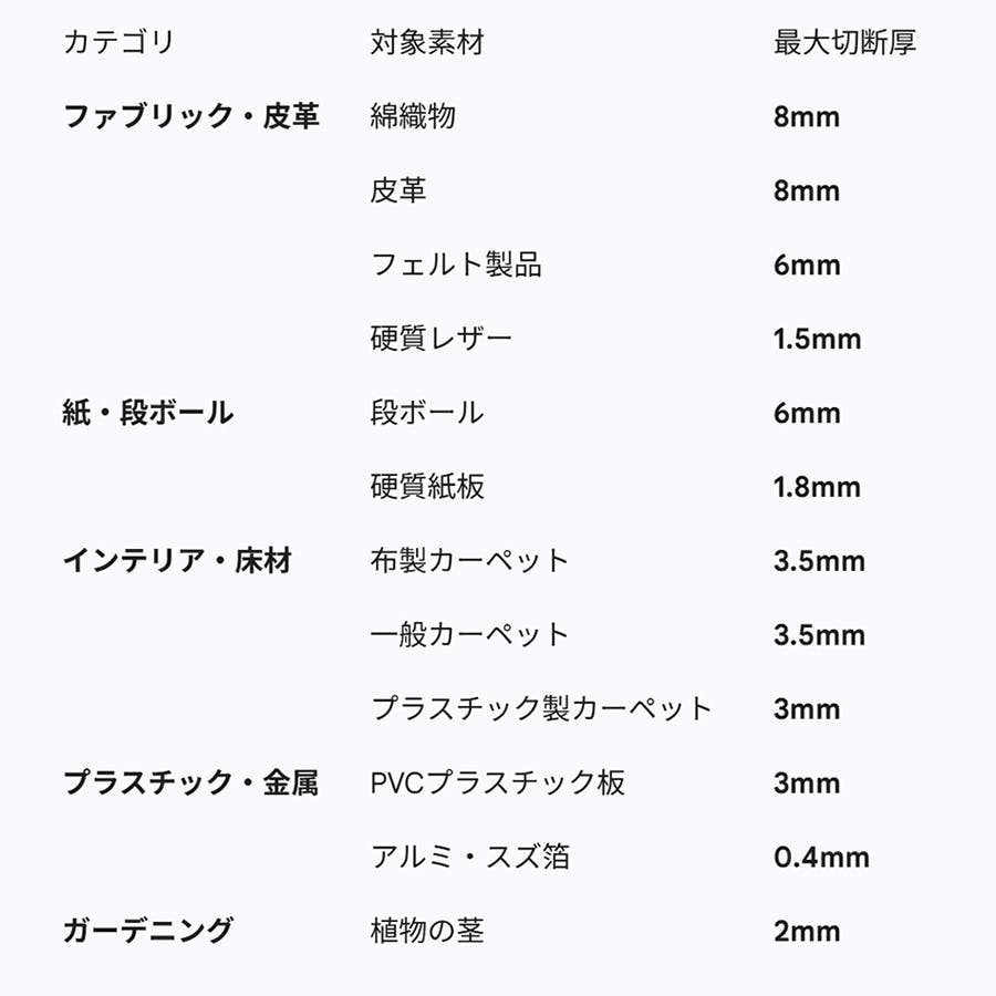 この表ぼ記載通り、特に綿織物や皮革の8mm、段ボールの6mmという数値が非常に強力であることがわかります。一般的なハサミやカッターでは苦戦する厚みも、このパワーなら「なぞるだけ」でカットする事が可能になります。