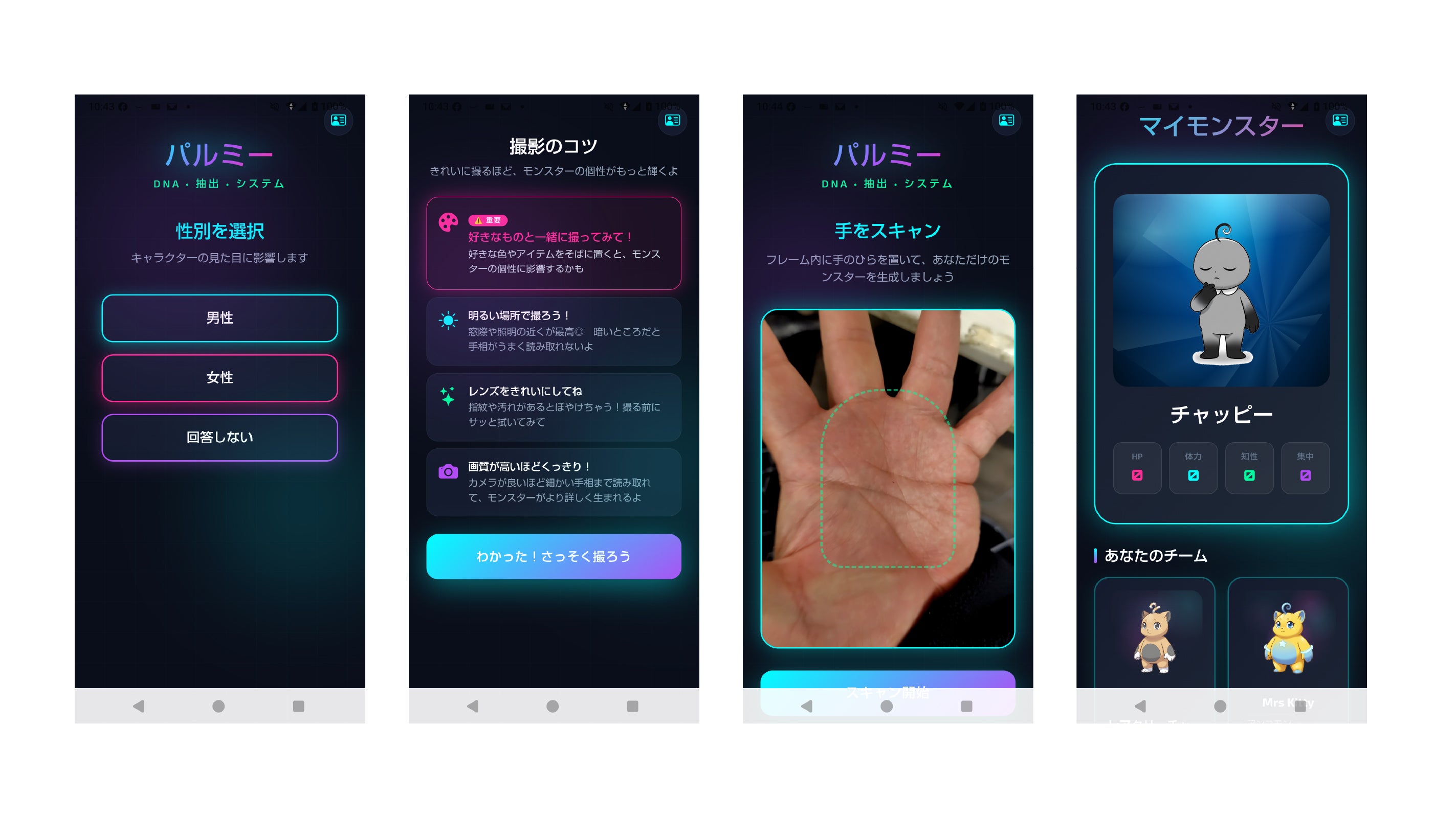 私たちは現在、手相をAIで解析し、世界に一体だけのキャラクターを自動生成する育成型アプリを開発しています。生まれたキャラクターは日々成長し、ケアを怠ると体調を崩すこともある“デジタルパートナー”です。診断体験と育成体験を融合させた、新しいエンターテインメントを提供します。