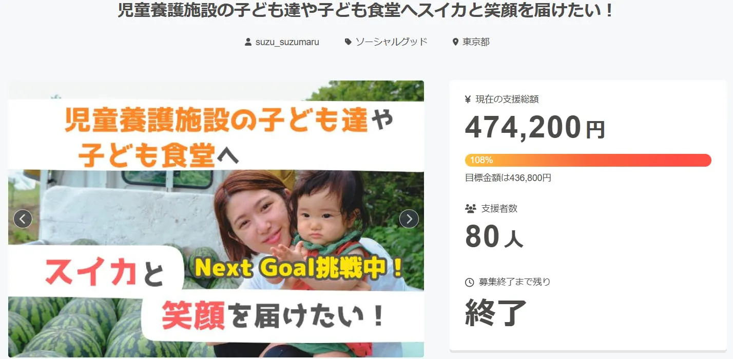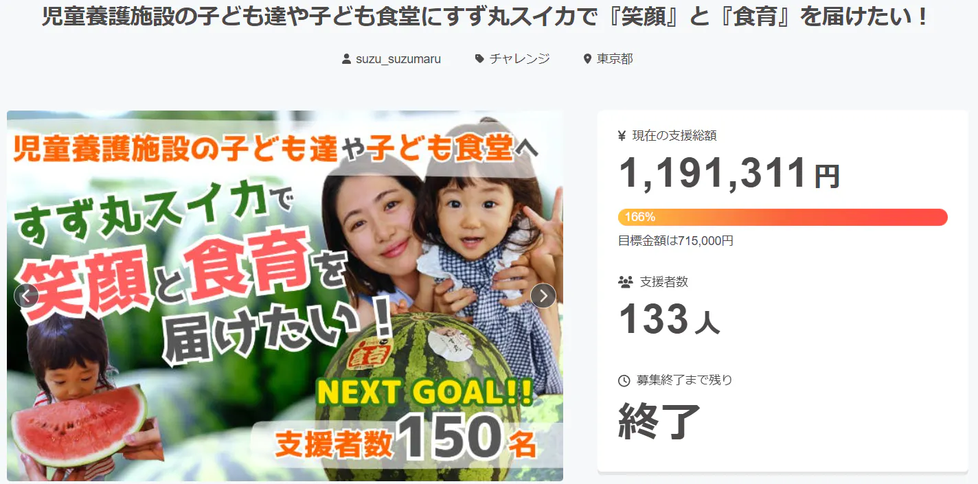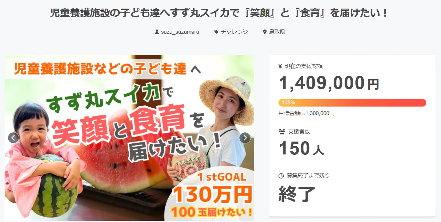 ※目標未達成の場合もご支援金額相当のすず丸スイカを寄贈します。