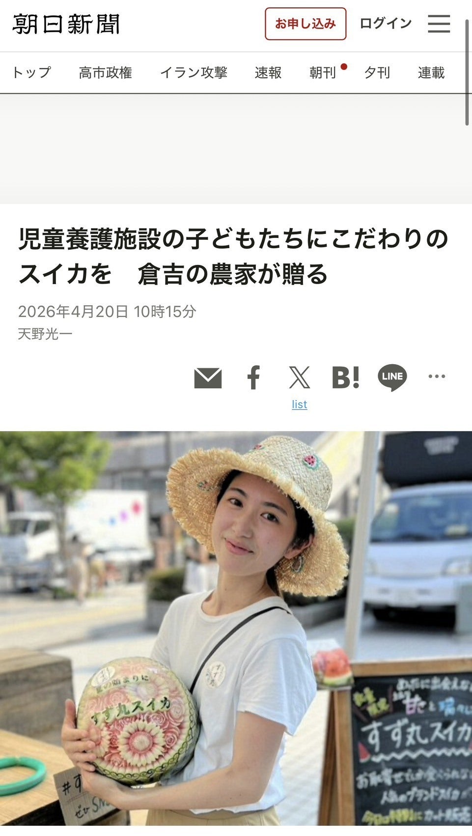 2026/04/20 12:13本日!朝日新聞の鳥取・島根の地方版とネット掲載をいただきました!【ネット記事はこちらから】今回こうして取り上げていただけたのは、これまで応援してくださった皆さまのおかげです。本当にありがとうございます。ライターの天野さん「世の中が少しぎすぎすしている今だからこそ、あたたかな気持ちになる話を書きたかった。子ども達への想いと、ご家族の愛情に心を動かされました。」といった言葉をいただきました。改めて、この活動はただスイカを届けているだけじゃないなと感じています。たくさんの人の想いがのったスイカが、子ども達のもとに届いて、それが“毎年の楽しみ”になっていく。そんな流れを、みなさんと一緒につくれていることがすごく嬉しいです。ありがとうございます!!!1人でも多くの子ども達に、1年でも長く届け続けられるようこれからも沢山の方に知っていただけるように頑張ります!!プロジェクトはあと1ヶ月少し。100玉のスイカを子ども達に届けるため引き続き拡散やご支援での応援、どうぞよろしくお願いいたします! もっと見る