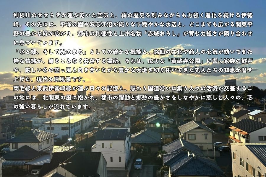赤城山の雄大なシルエットを北に仰ぎ、利根川・広瀬川の豊かな水辺と、高速交通網が繋ぐ北関東の利便性が息づく群馬県伊勢崎市。「旧時報鐘楼」が刻む絹産業の遺産と、厳しいからっ風の中で育まれてきた不屈のものづくり精神は、訪れる人々を魅了しています。