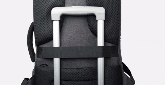 スーツケースの持ち手に固定するバンドつきなのも、リュックにはなかなかない嬉しい装備です。