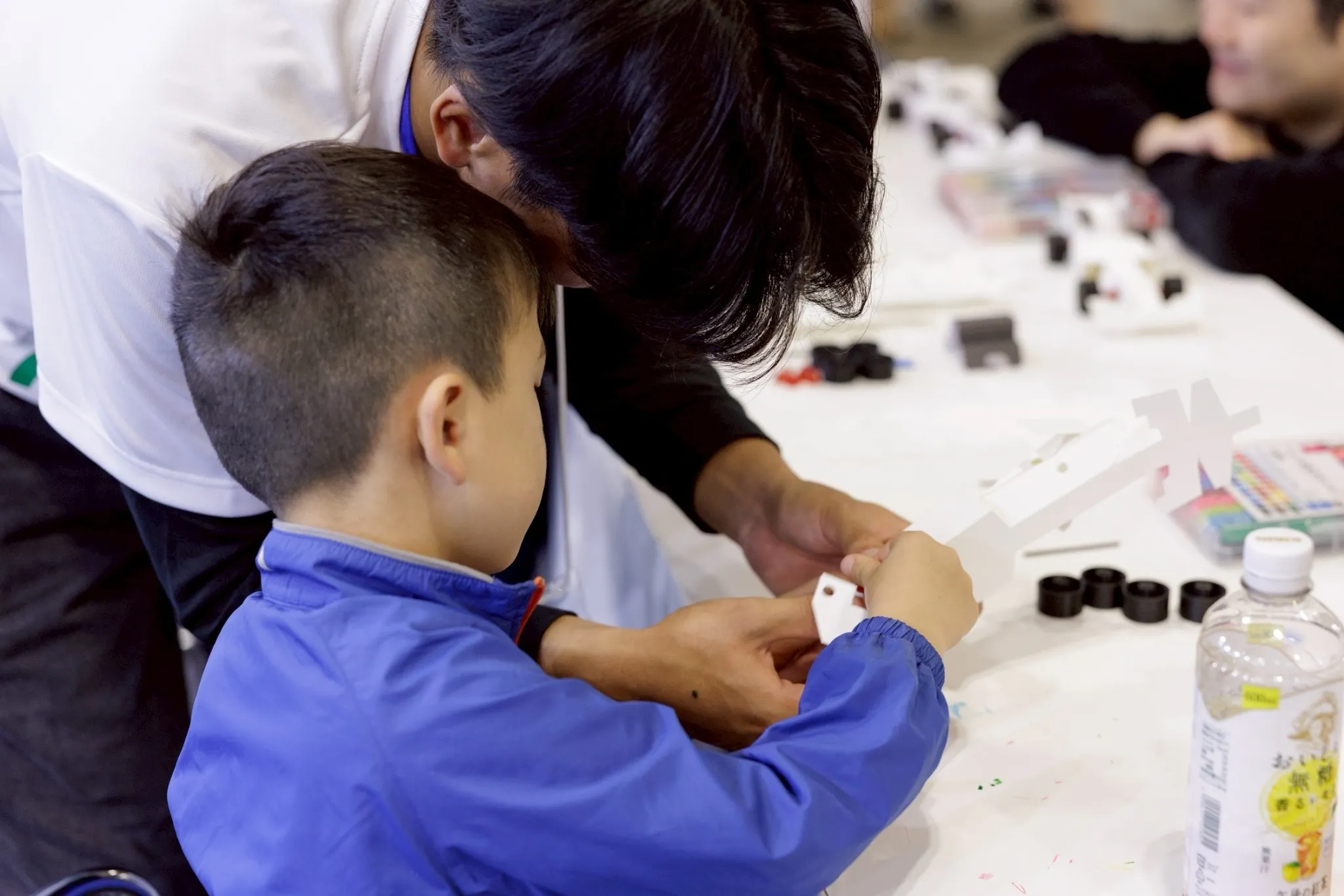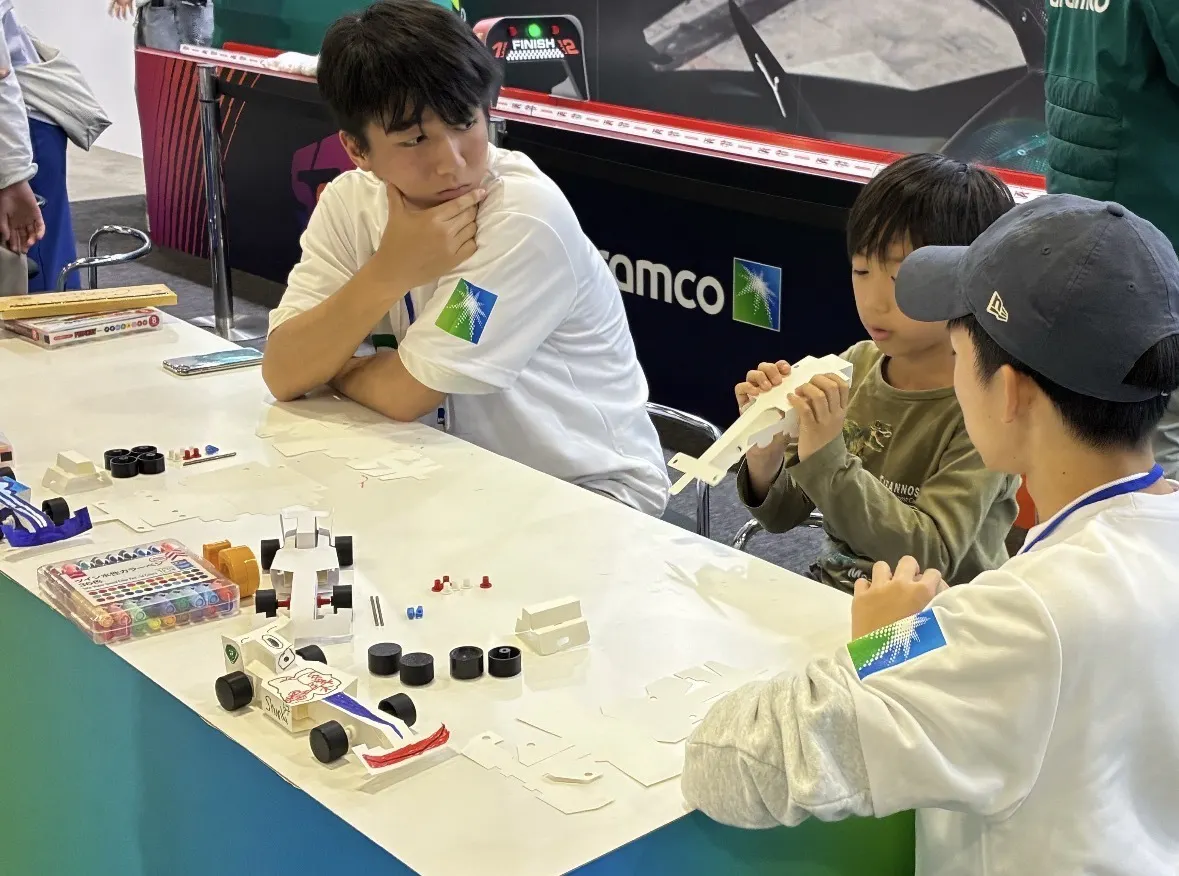 ミニチュアF1カーを子供と作っていると、 「私もやる!」と叫んで、親の手を引っ張る子供。終わりが近づくと、まだ続けたくて泣いている子もいた。