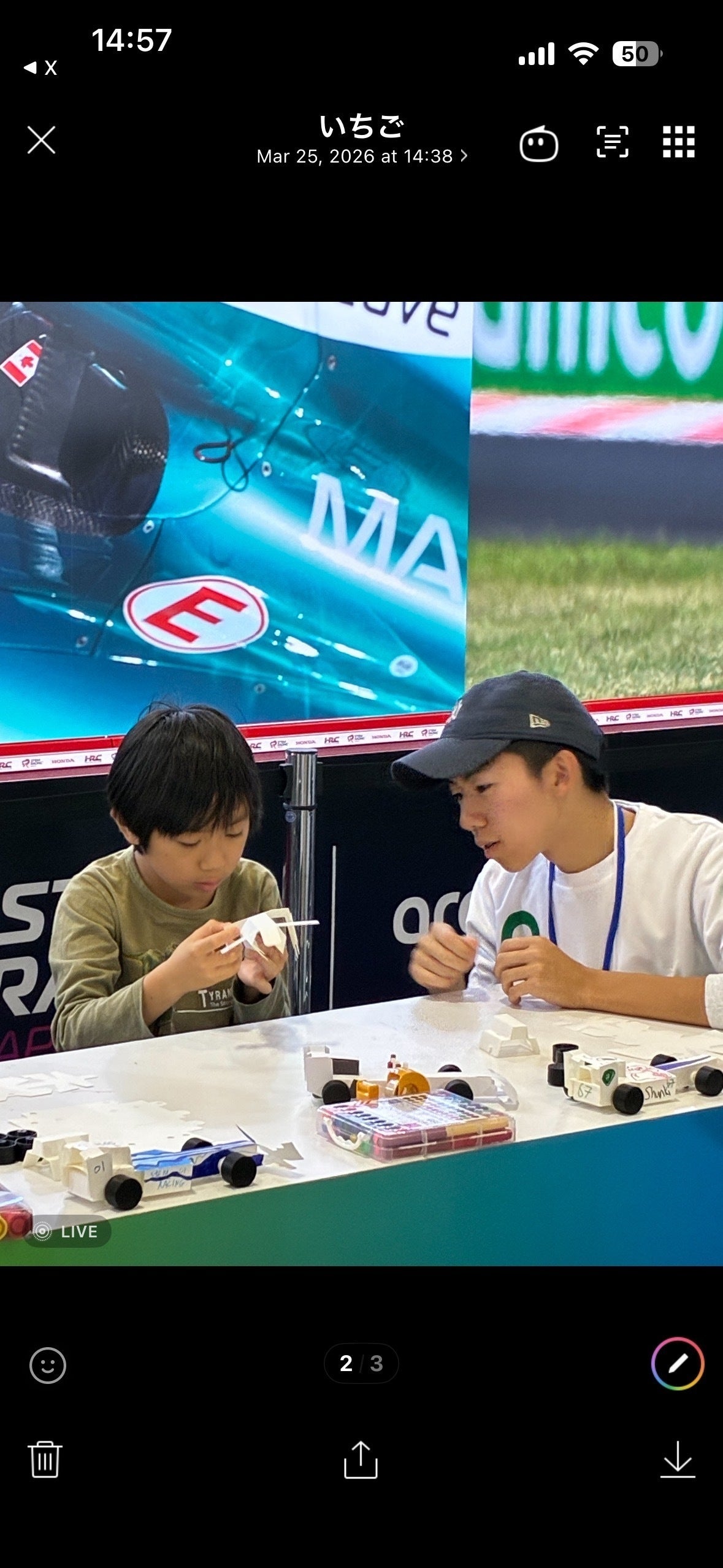 ミニチュアF1カーを子供と作っていると、 「私もやる!」と叫んで、親の手を引っ張る子供。終わりが近づくと、まだ続けたくて泣いている子もいた。