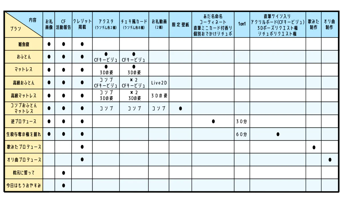 リターンはCF活動報告のみ、今日はもうおやすみプランと同一の内容です
