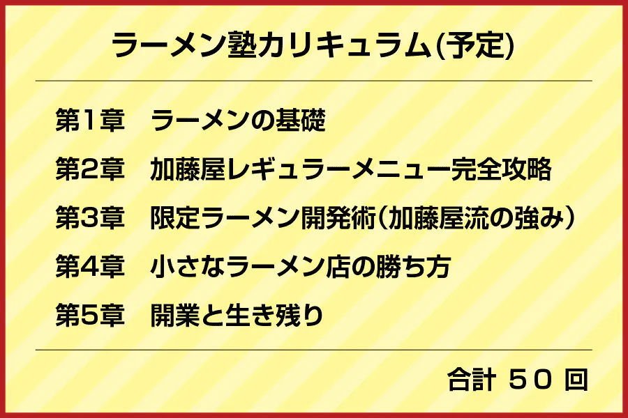 ラーメン塾については次のようなカリキュラムを想定しています。