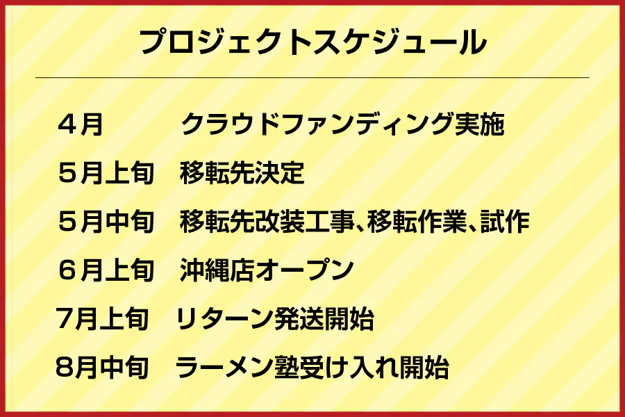 このプロジェクトで、必ず沖縄に新しい店を作り、ラーメン塾を実現します。