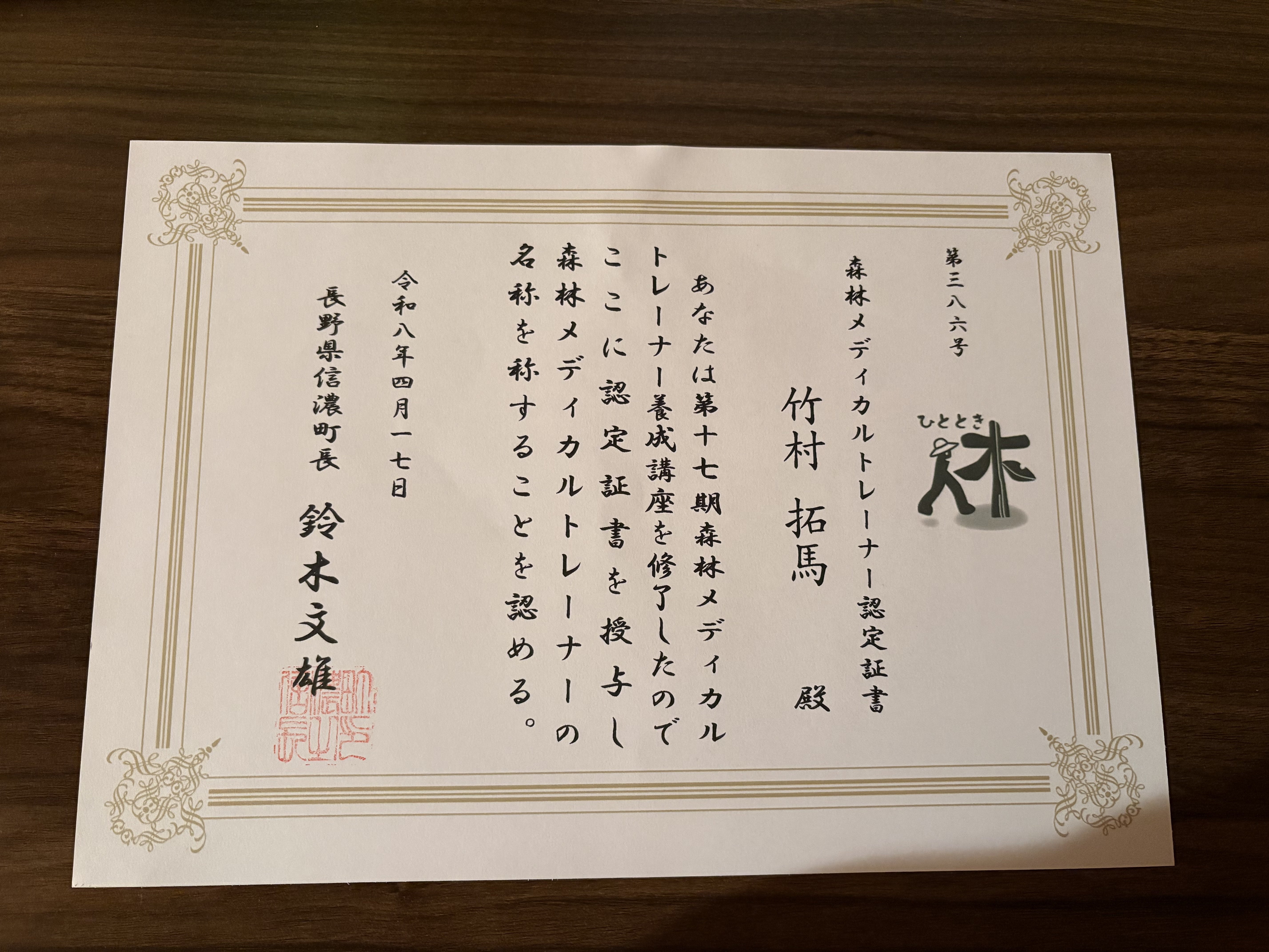 そして昨日、森林メディカルトレーナーの認定をいただきました。