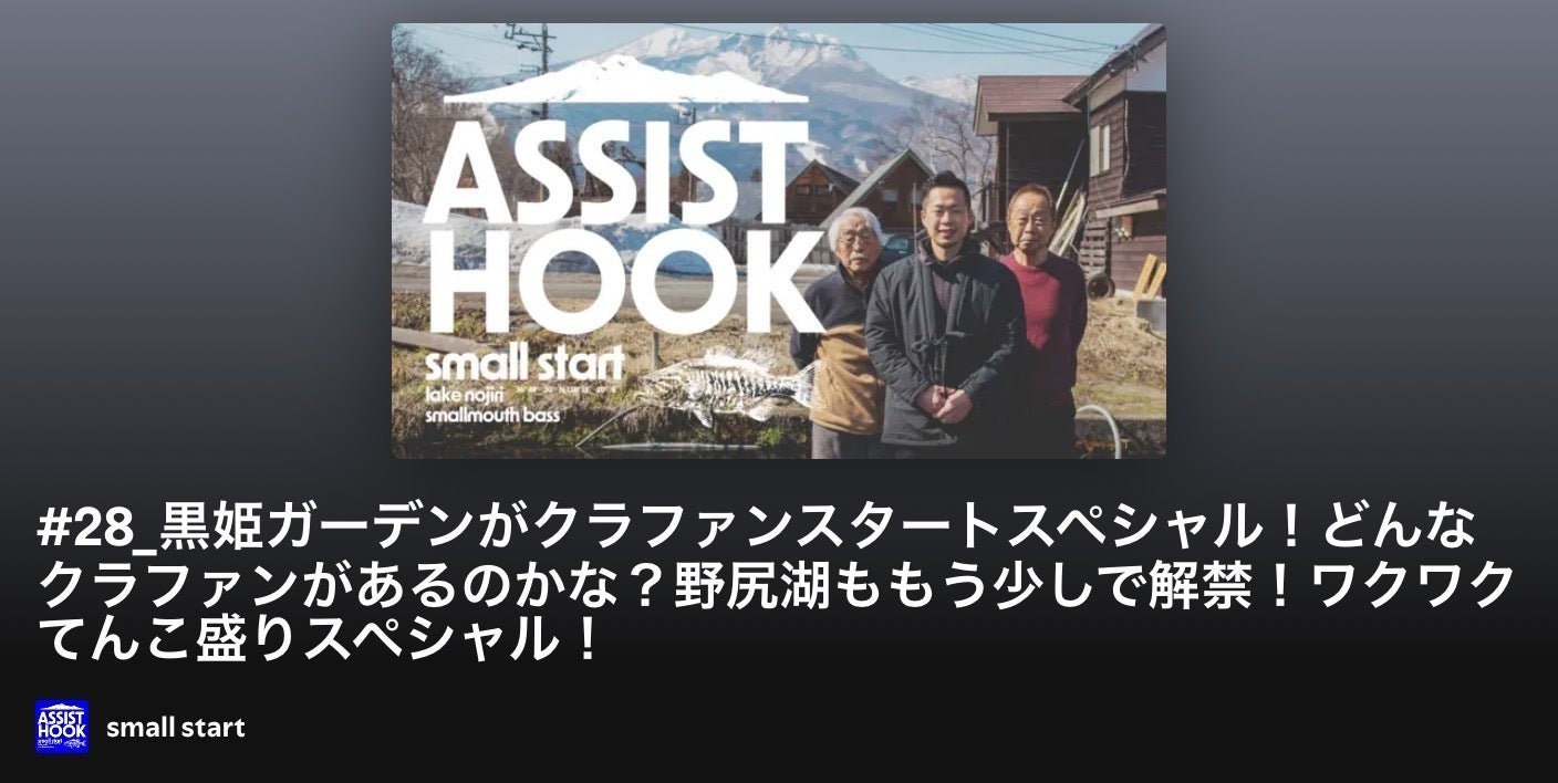 そして本日、ページの写真撮影や、リターン構成、そもそもエリアトラウト(管理釣り場)構想を一緒に取り組んでくれたsmall start代表の平野さんとONE-OFF代表の宮入さんがMCを務めるPodcast「ASSIST HOOK by smallstart」にゲスト出演させていただきました!