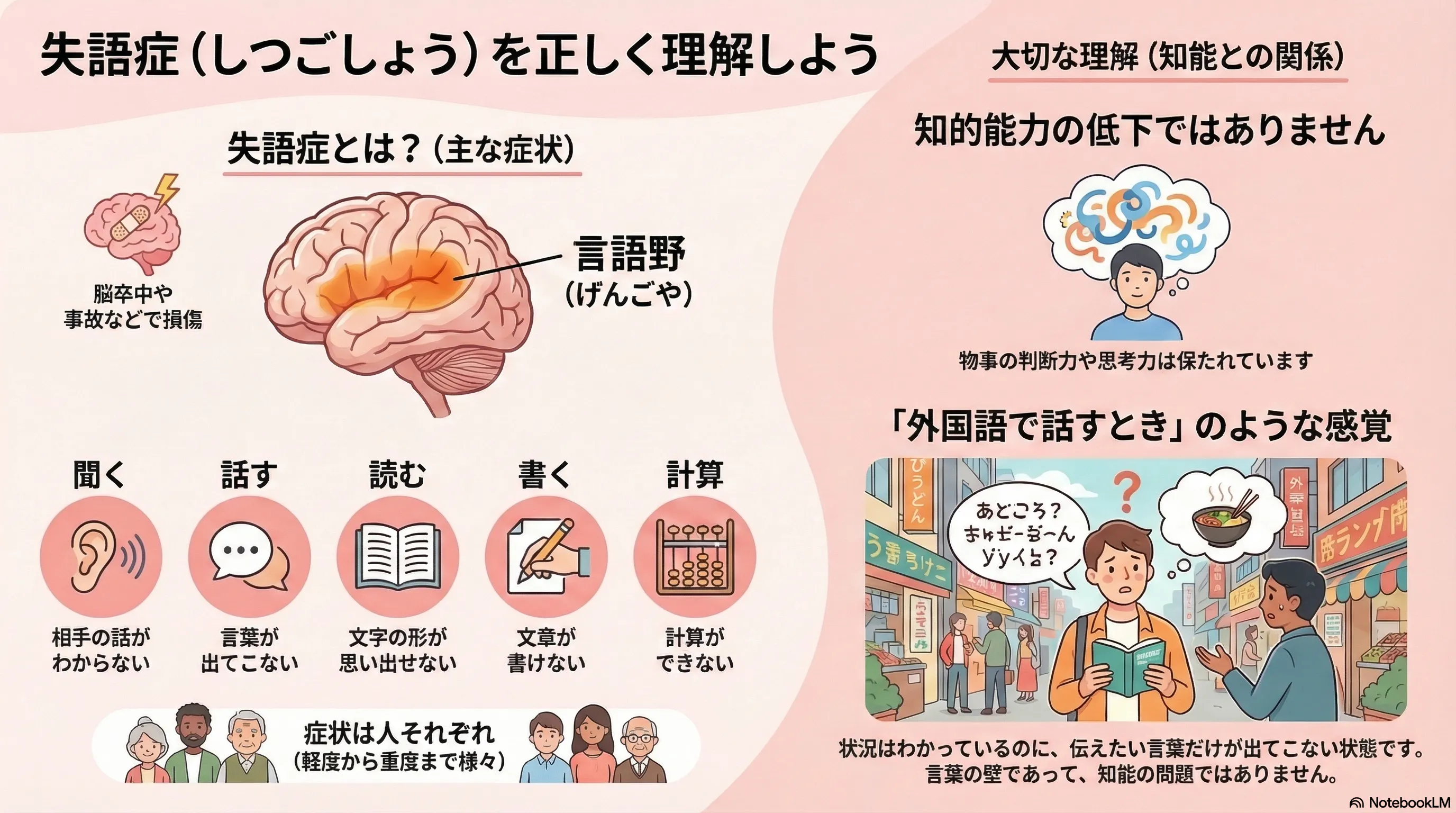 ただし、ことばが難しくなっただけで、知的能力とは関係ありません。英語などの外国語で会話するときを想像してみてください。言いたいことはある、状況もわかる、でも言葉だけがついてこない。それが失語症の方なのです。