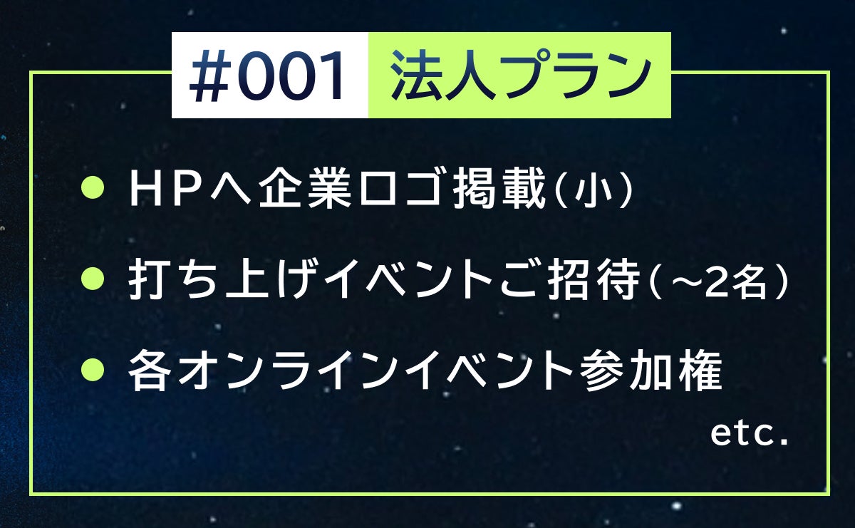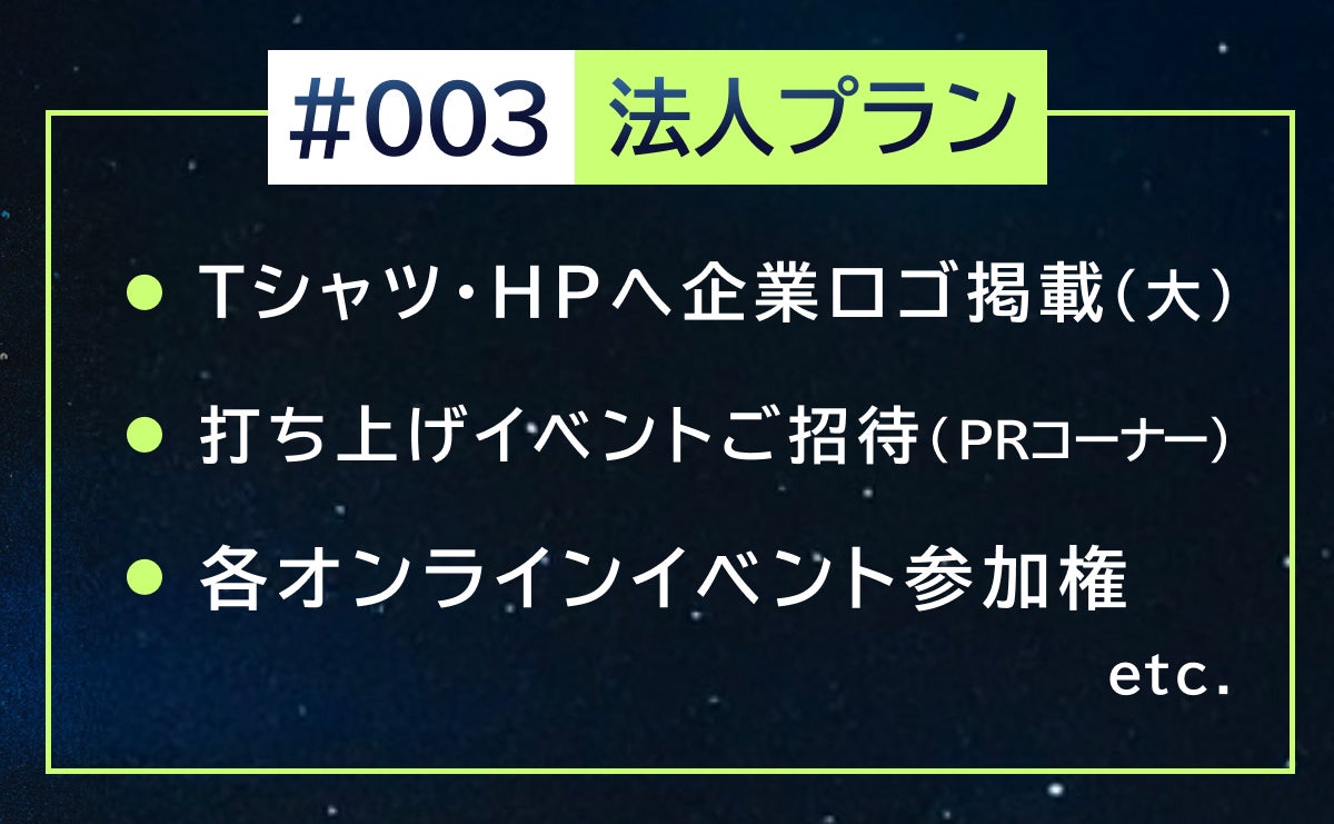 ・打ち上げの中止が決定した場合には、参加プラン#012〜013、法人プラン#001〜003に含まれる打ち上げイベントへの参加権は無効となります。あらかじめご了承ください。