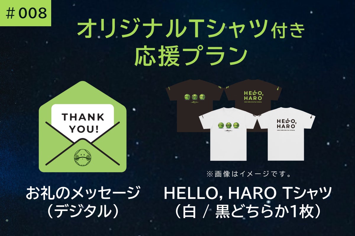 ミッションへの参加が難しい方にも、本プロジェクトを支えた一員としてご参加いただける複数の「応援プラン」をご用意しました。すべての応援プランには、特典として「HELLO, HARO」オリジナルグッズがつきます!