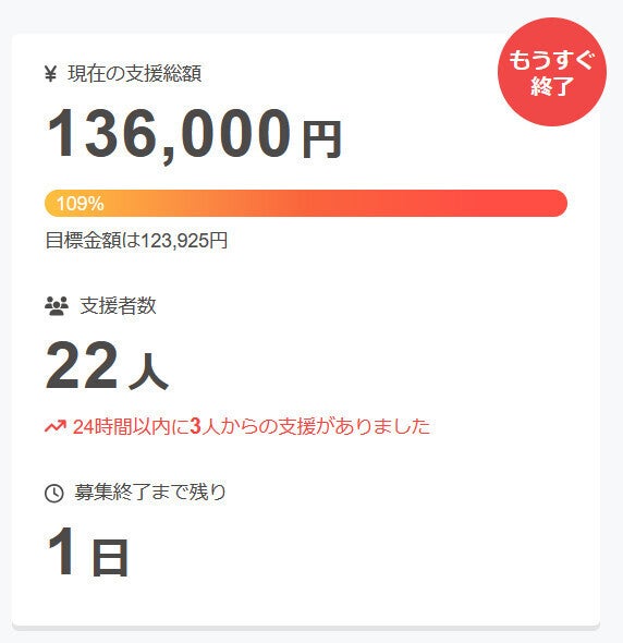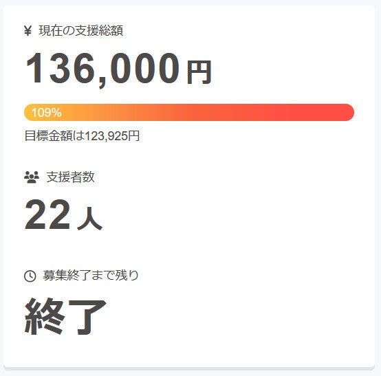 2026/03/30 19:15お世話になっております。 名無しの東北県人です。 前回の活動報告から現在までの間に、 新たに2名の方がご支援を行って下さいました。 現在の調達率は109%、パトロン様は22名となっております。 本当にありがとうございます。 引き続き、何卒宜しくお願い致します。 もっと見る