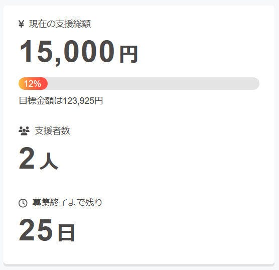 お世話になっております。 名無しの東北県人です。 前回の活動報告から現在までの間に、 新たに1名の方がご支援を行って下さいました。 現在の調達率は24%、パトロン様は5名となっております。 本当にありがとうございます。 引き続き、何卒宜しくお願い致します。