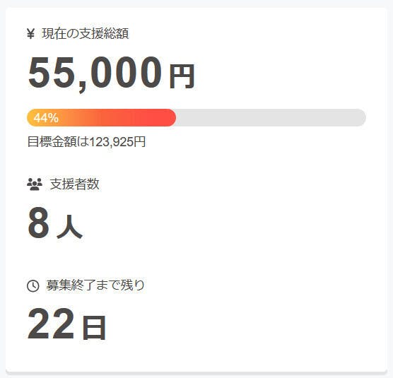 現在の調達率は44%、パトロン様は8名となっております。